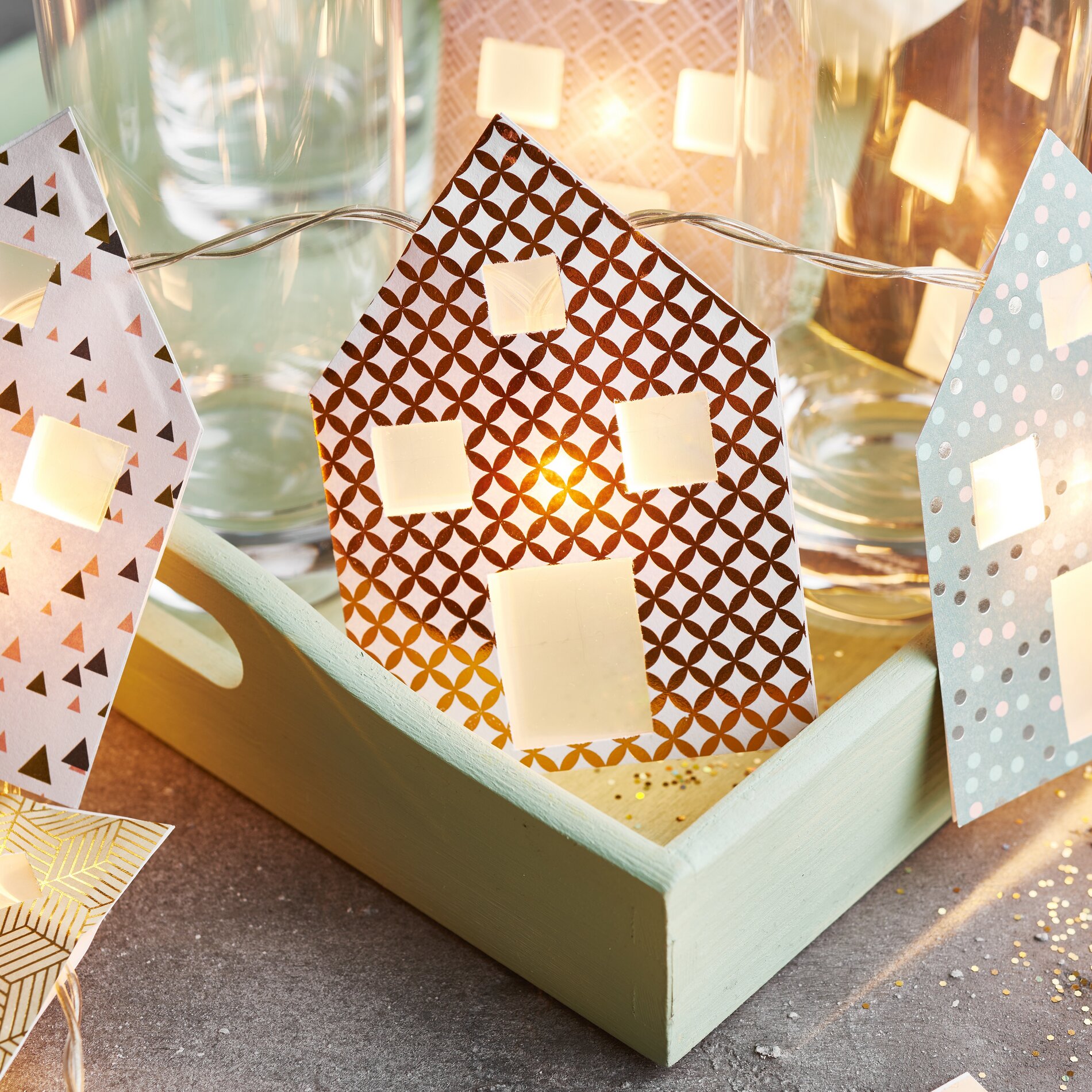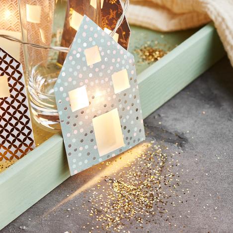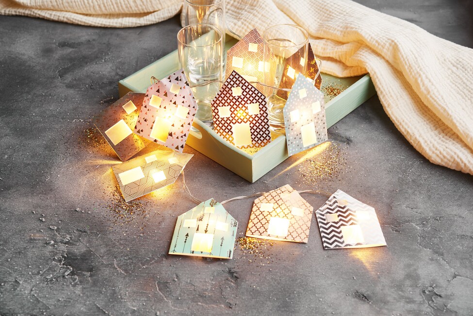 Powtórz ten proces dla wszystkich domków, aż uzyskasz kompletny ciąg świecących domków, które stworzą piękną girlandę.