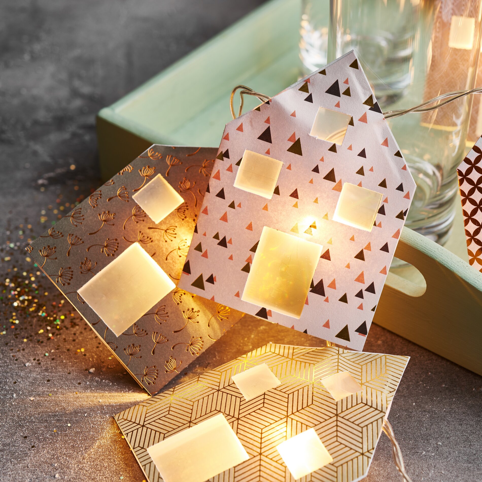 Najpierw sklej ze sobą otwartą stronę domku. Następnie wepchnij jedną z lampek do domku od góry i zamocuj ją bezpiecznie. Na koniec sklej górną część dachu, aby zakończyć budowę domku.