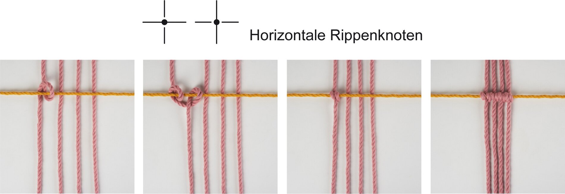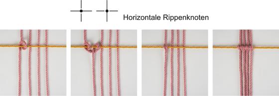 Potrzebujesz teraz kawałka przędzy, który ułożysz poziomo nad 44 podwójnymi nitkami i który będzie nieco dłuższy po obu stronach. Przymocuj tę poziomą poprzeczną nitkę mocno do stołu za pomocą bardzo mocnej taśmy klejącej. Zawiąż wszystkie 44 podwójne nitki poziomym węzłem krzyżowym.