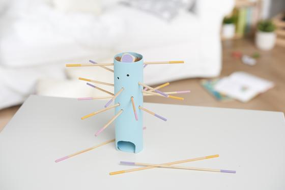 Aby rozpocząć grę, wepchnij wszystkie kolorowe bambusowe szaszłyki do otworów i włóż oczka od góry. Teraz rzuć kostką.