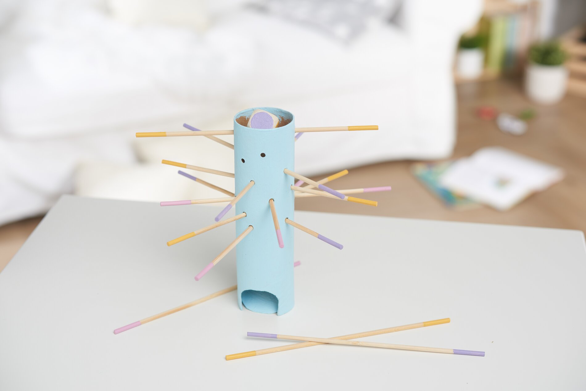 Teraz pomaluj kartonową rolkę na swój ulubiony kolor, a końce (2 cm) 4 szaszłyków na ten sam kolor (12 szaszłyków w 3 kolorach, w tym 4 szaszłyki w jednym kolorze).