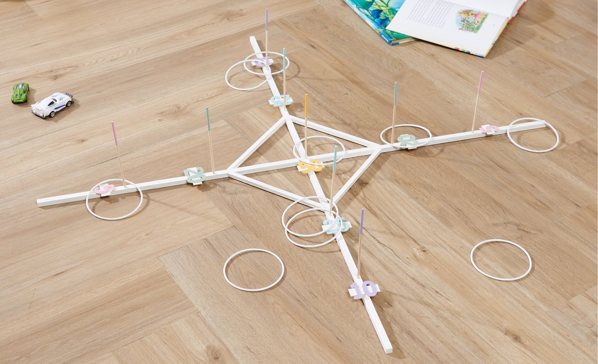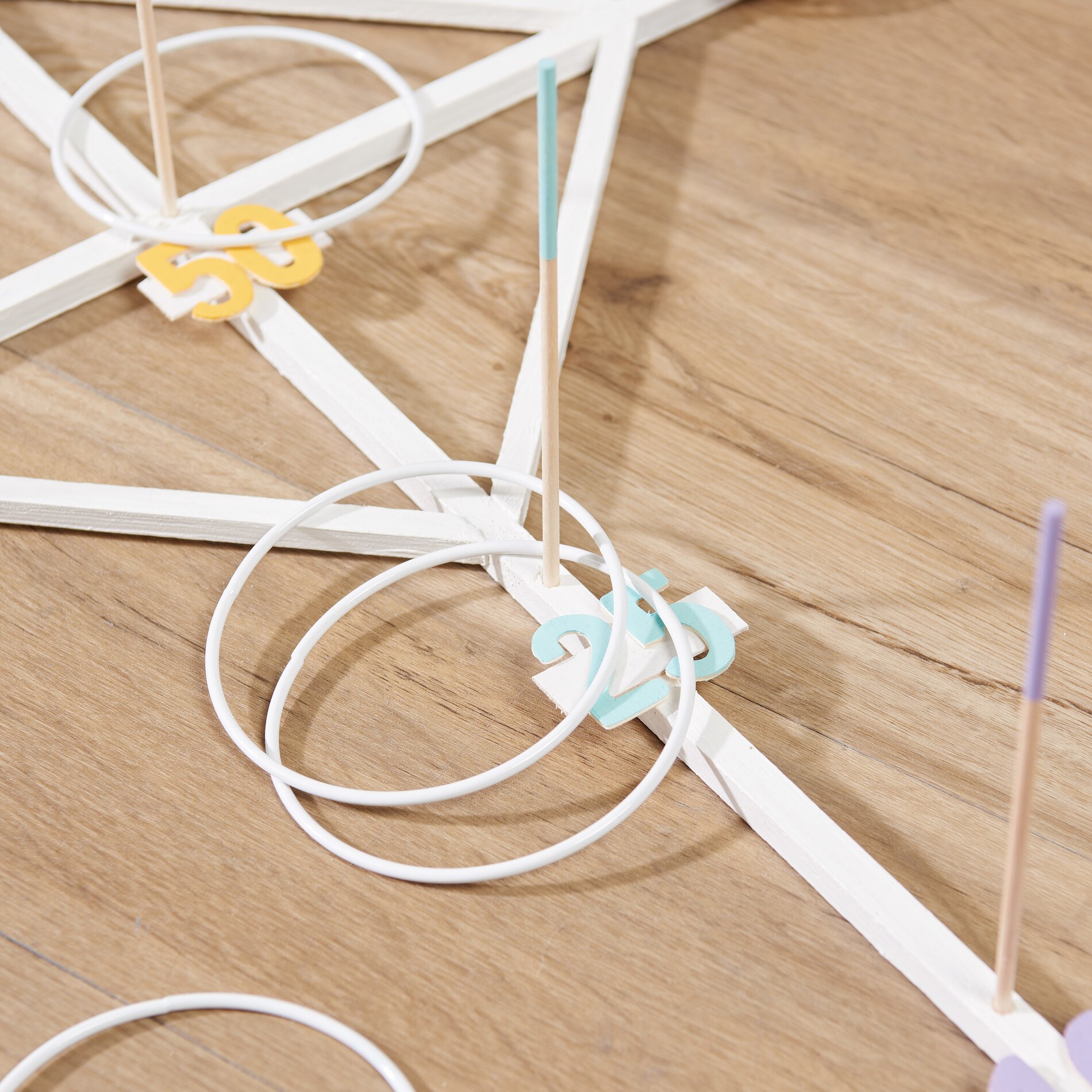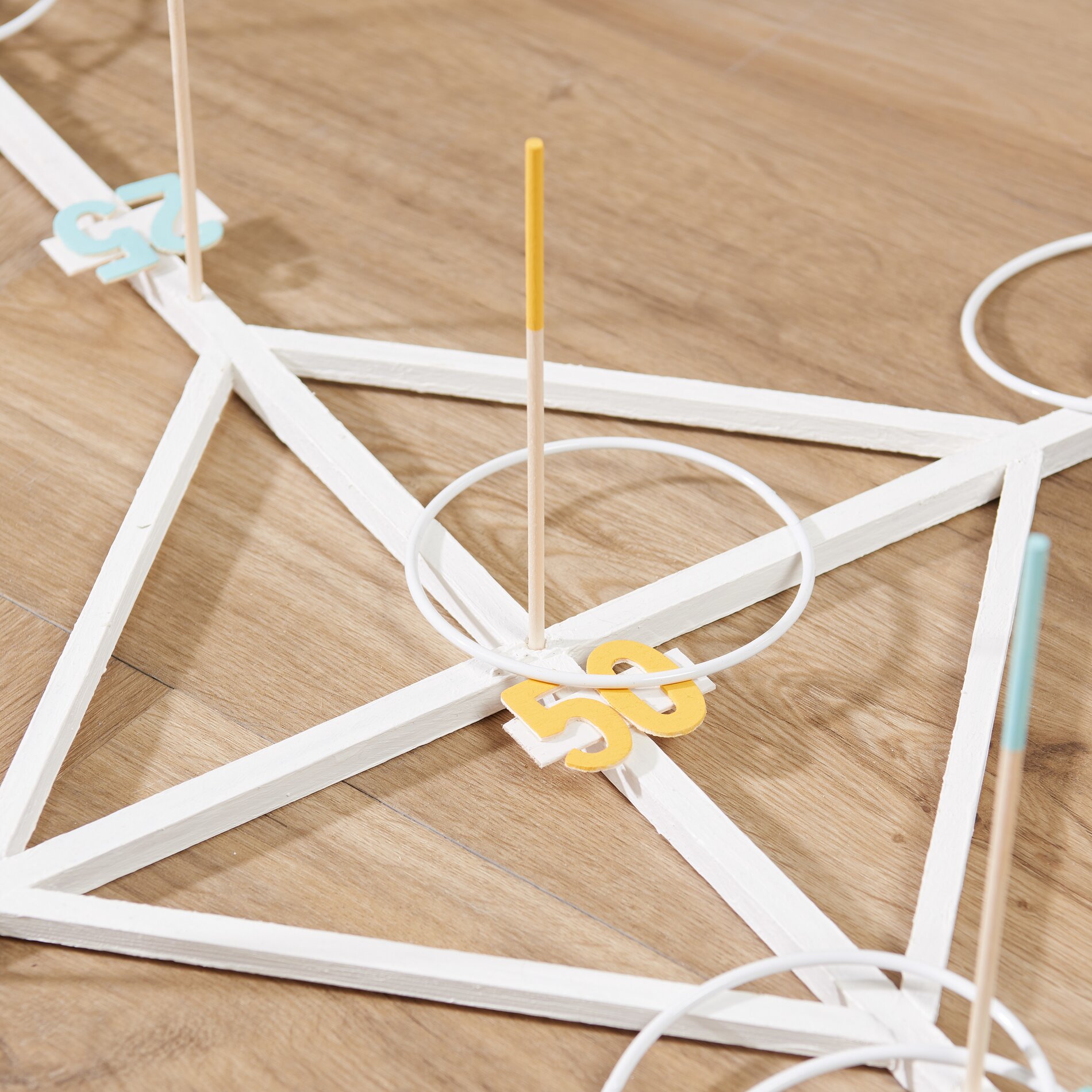 Zaczynając od środka drewnianego krzyża, narysuj oznaczenia w regularnych odstępach i wywierć małe otwory w tych punktach. W tych miejscach zostaną później zamocowane "okrągłe pręty docelowe".