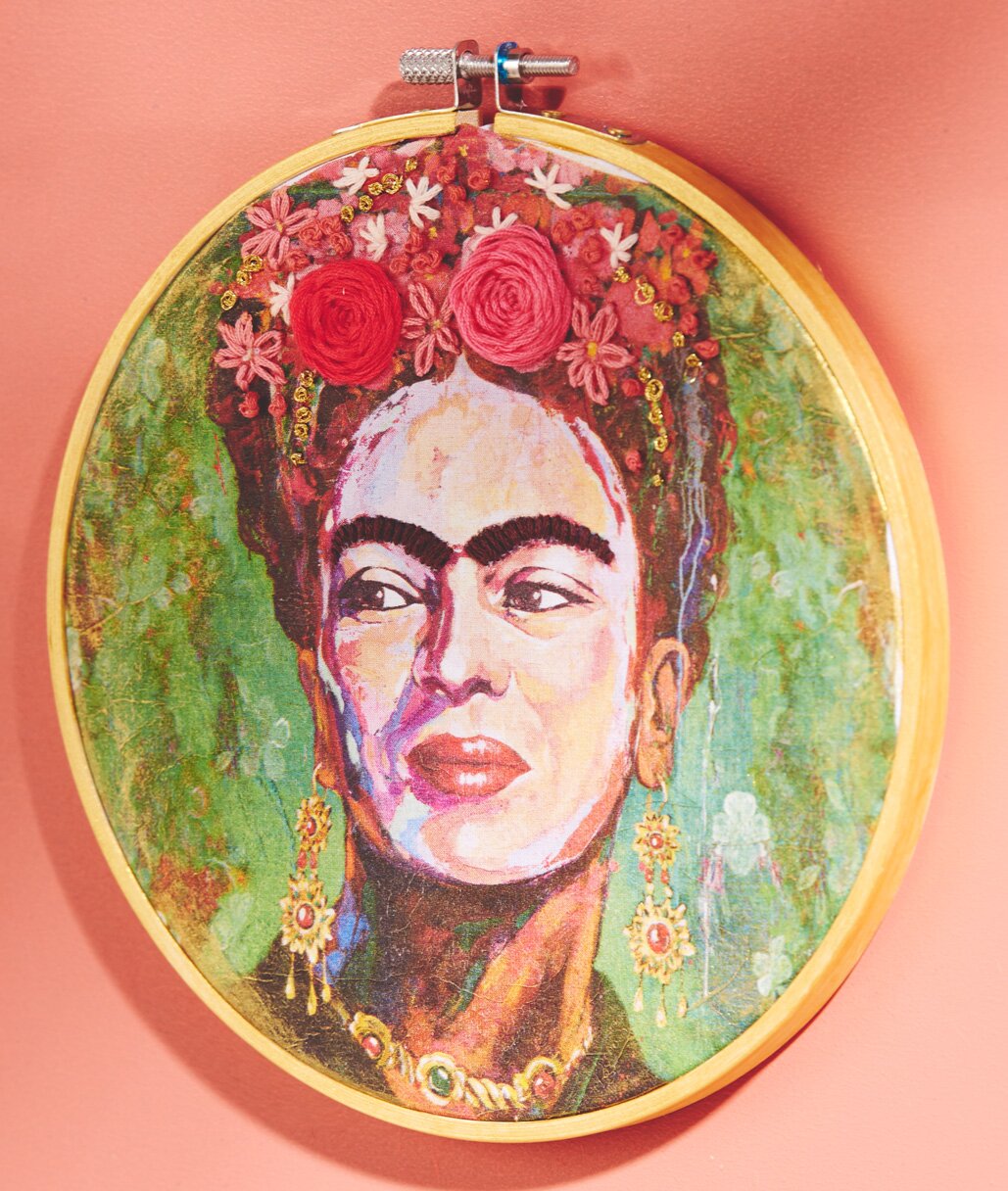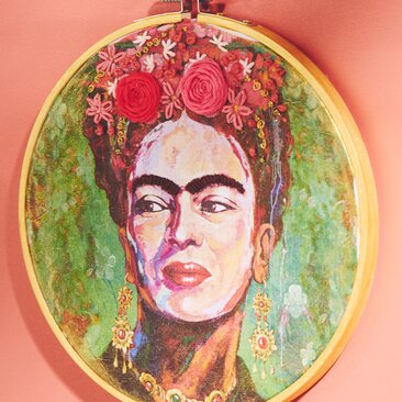 W przypadku obrazu z kółkiem do haftu o średnicy 21,5 cm potrzebny będzie wykrój z tkaniny o wymiarach ok. 27,5 x 27,5 cm.