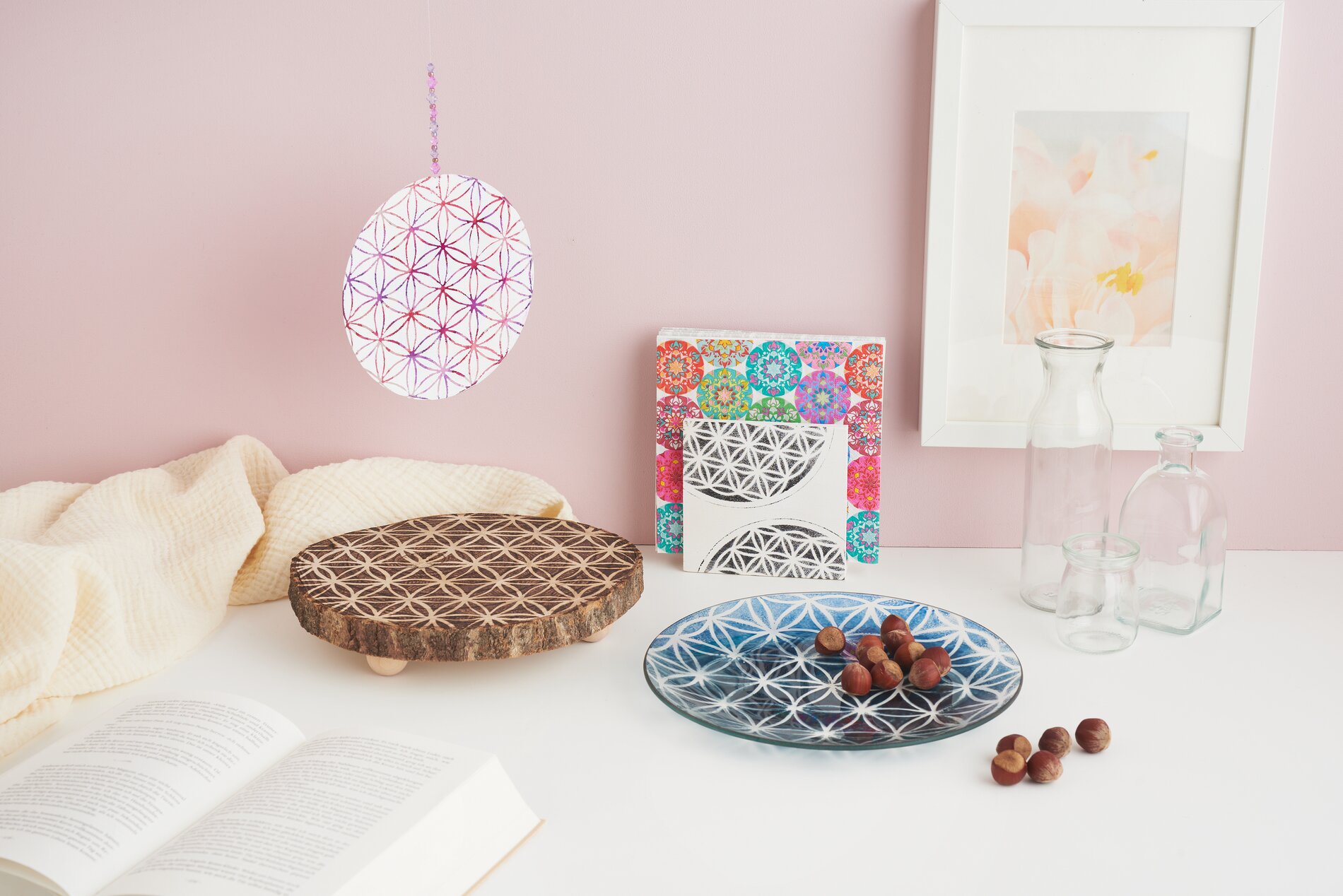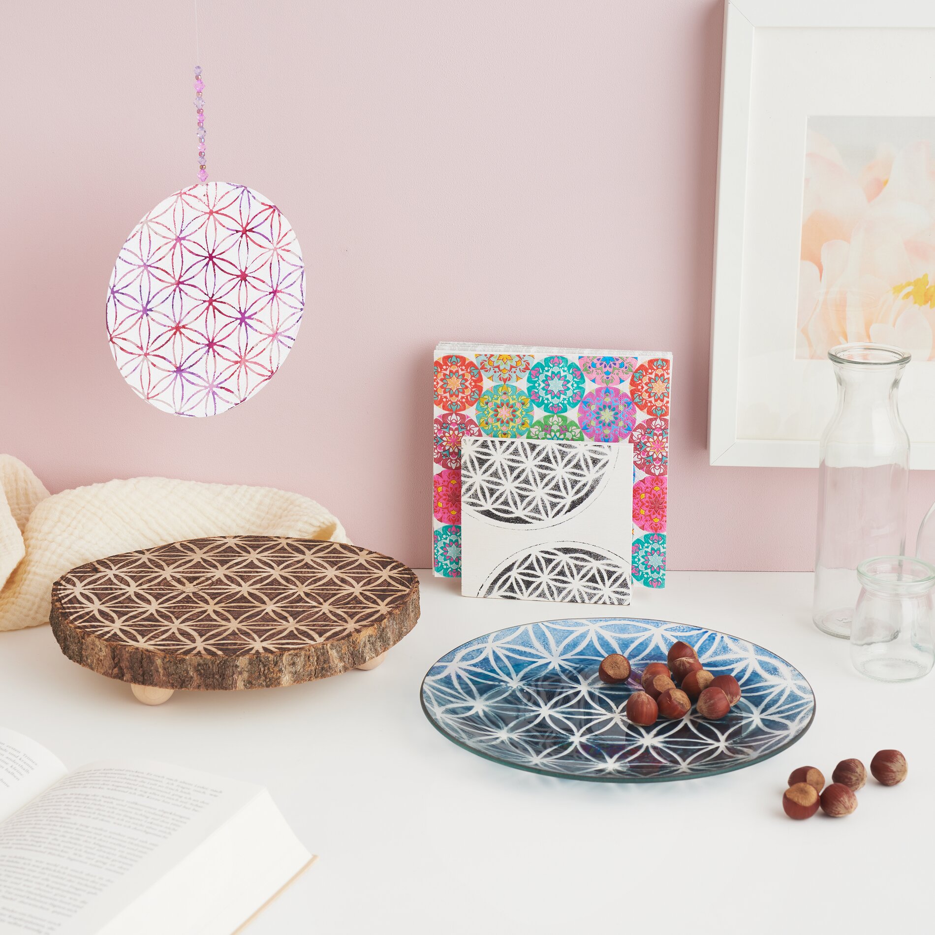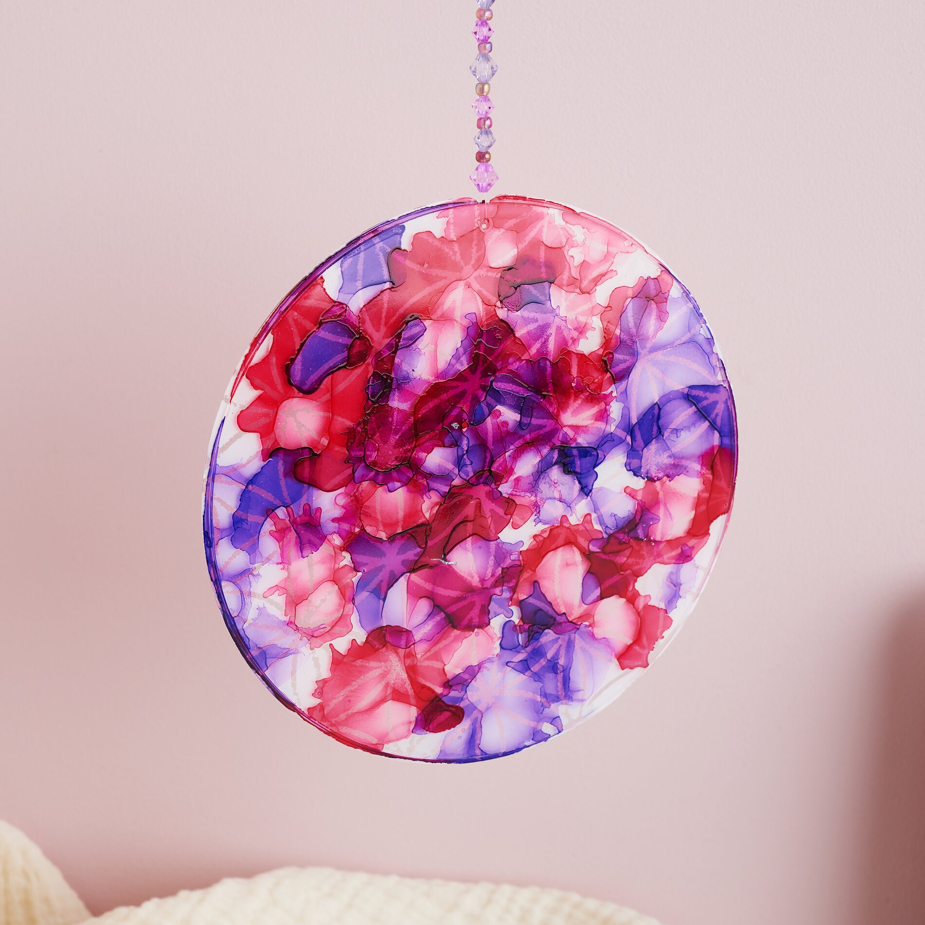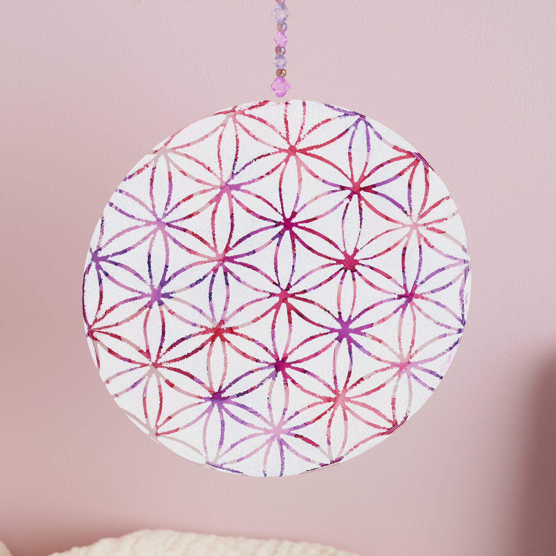Odwrócić płytę i nanieść szablon za pomocą kleju w sprayu na nieobrobioną stronę. Pokropić motyw farbą rzemieślniczą, usunąć szablon i natychmiast go wyczyścić. Po wyschnięciu wywiercić mały otwór w akrylowym krążku za pomocą wiertarki ręcznej. Proszę przewlec przez niego nić perlonową, nawlec koraliki według uznania i zawiązać końce - dekoracyjny element przyciągający wzrok jest gotowy.