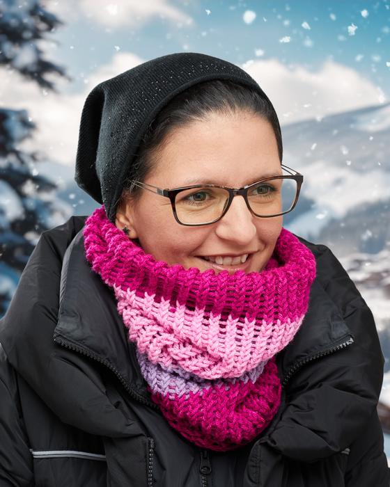Teraz przesuń pozostały ścieg o jeden oczek w lewo, tak aby na kółku do haftu było o jedno oczko mniej. Dwa oczka na lewo od tej przerwy tworzą teraz kolejną parę do zamykania: Owinąć nitkę wokół lewego oczka, unieść dolne oczko ponad górne oczko, a następnie nowo przerobione oczko ponad prawe oczko. Ponownie przerobić oba oczka razem na prawo, zawinąć pętelkę, podnieść oczko dolne z powrotem nad oczko górne i przesunąć to ostatnie oczko o jeden słupek w lewo.