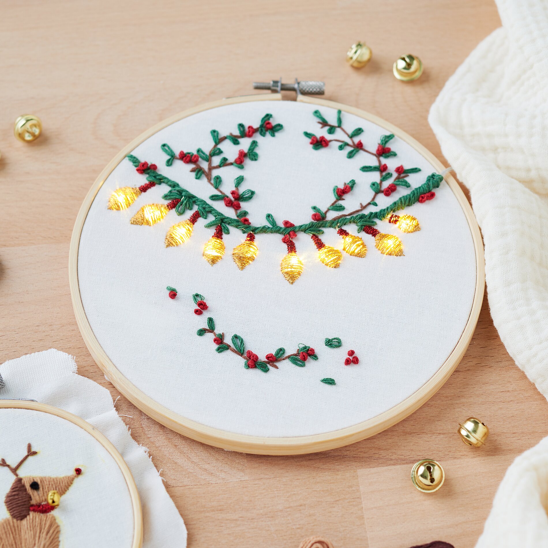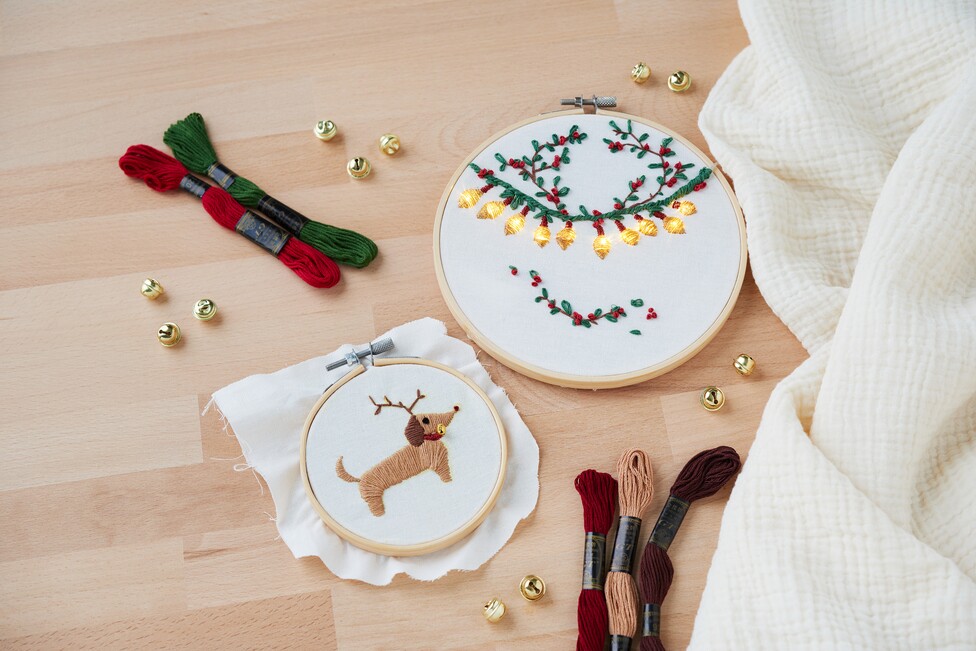 Nadszedł czas na wyhaftowanie motywów. Podążaj za konturami, które przeniosłeś na tkaninę w pierwszym kroku i daj się ponieść kreatywności. Użyj różnych technik haftu, aby nadać motywom głębię i teksturę. Wyhaftuj również żarówki LED.