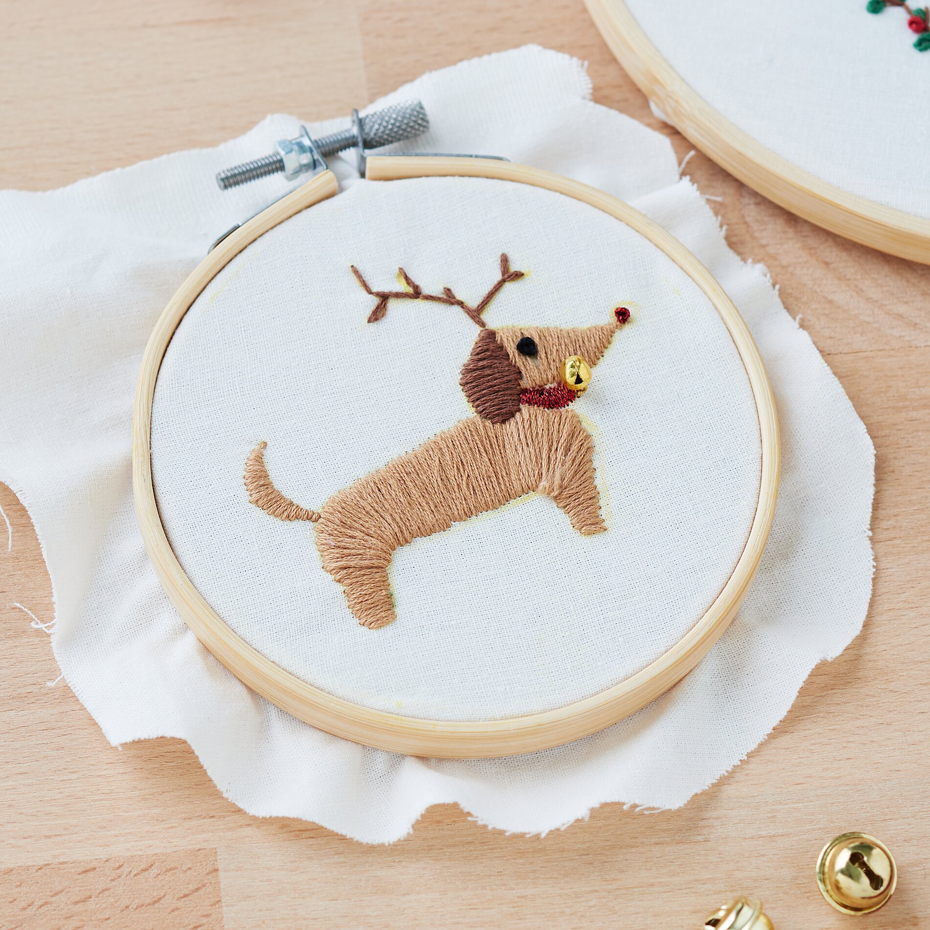 Tak zwany węzeł francuski nadaje się do delikatniejszych elementów, takich jak jagody i nos jamnika. Przeprowadź igłę przez materiał od dołu, owiń nić wokół końcówki igły kilka razy, a następnie przeprowadź igłę z powrotem przez materiał. W ten sposób powstanie mały, okrągły węzeł. Powtarzaj ten proces, aż element będzie kompletny i zawiąż nić bezpiecznie od spodu.