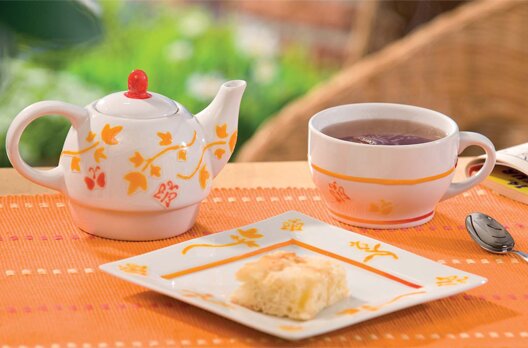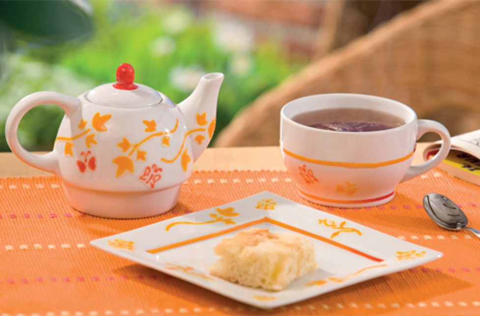Użyj szablonu, aby ozdobić ten praktyczny czajniczek z pasującą filiżanką misternymi ornamentami, które po wypaleniu w piekarniku nadają się nawet do mycia w zmywarce.
