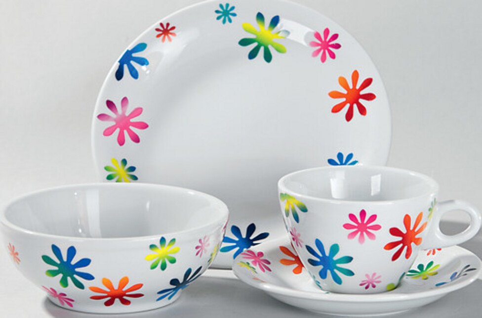 Folie dekoracyjne z modnym gradientem kolorów można łatwo wykrawać lub wycinać i nakładać na porcelanę. Po upieczeniu w piekarniku, nowe wesołe naczynia można bez wahania umyć ręcznie.