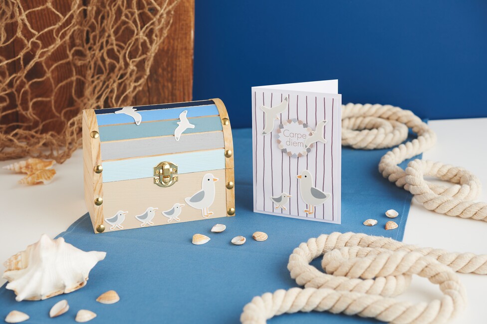 Proszę wypróbować papierowe kształty, aż spodoba się Państwu ich układ. Następnie proszę przykleić je klejem rzemieślniczym. Klej rzemieślniczy jest idealny do papieru i drewna, ponieważ schnie przezroczysto i tworzy stabilne połączenie. Dzięki temu prosta drewniana skrzynia stanie się spersonalizowanym przedmiotem dekoracyjnym.