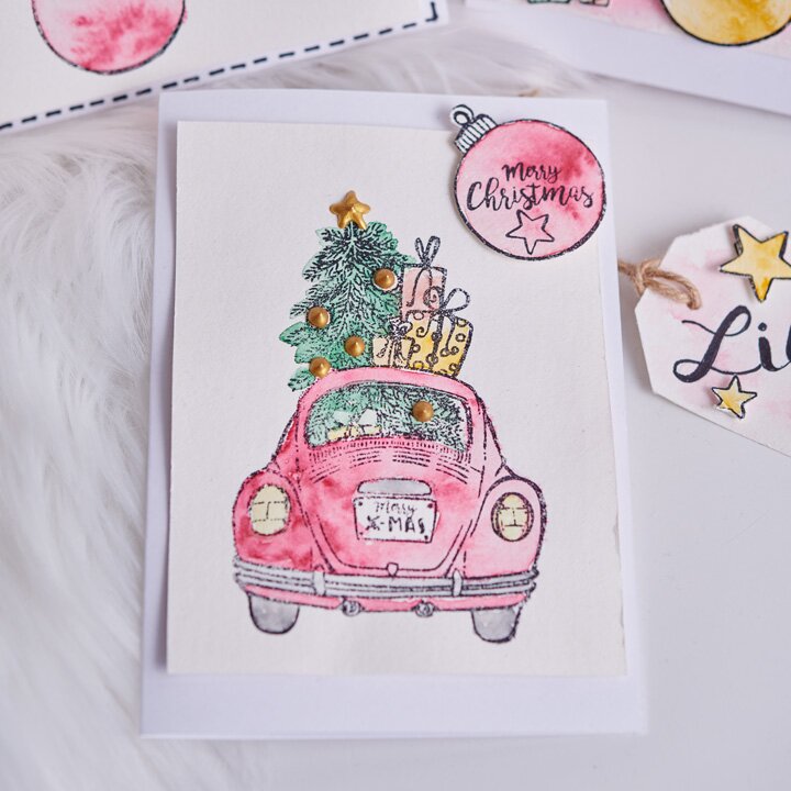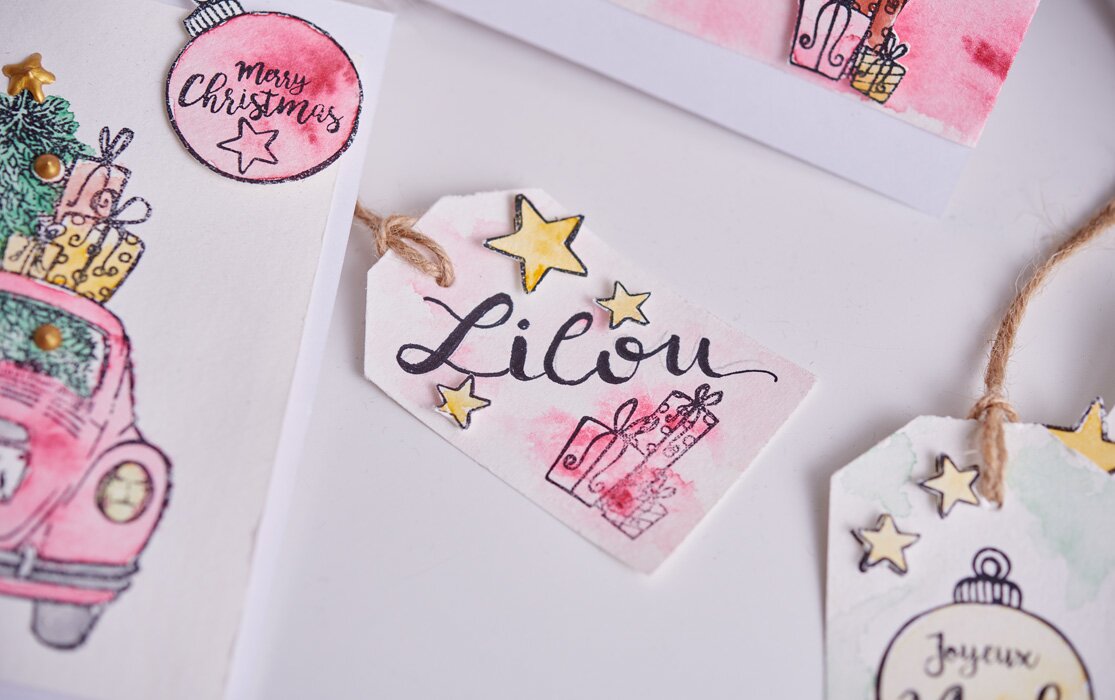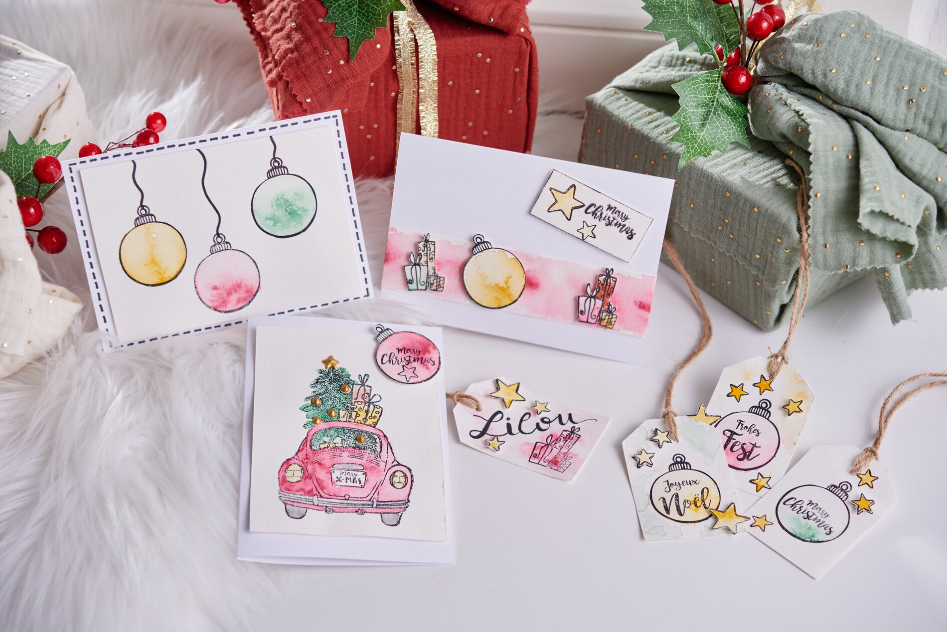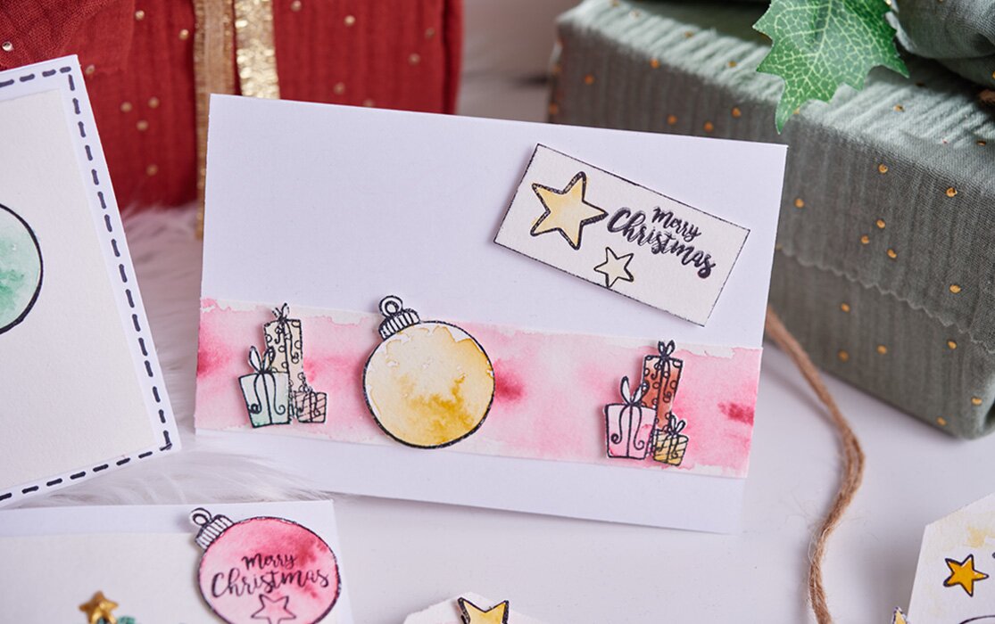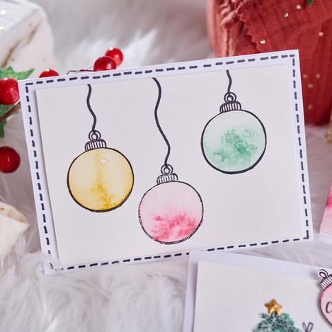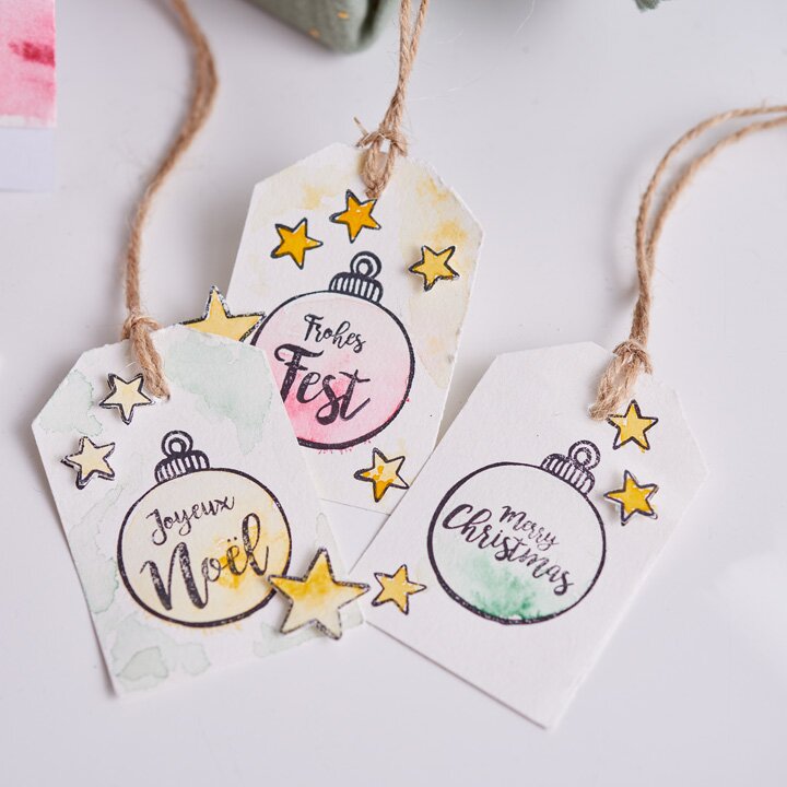 Aby skorzystać z tego pomysłu, należy najpierw wyciąć z wysokiej jakości papieru akwarelowego obszary do malowania kartek i małych zawieszek na prezenty. Następnie użyj silikonowych stempli VBS "Merry X-Mas", aby wyczarować kontury pięknych motywów na papierze.