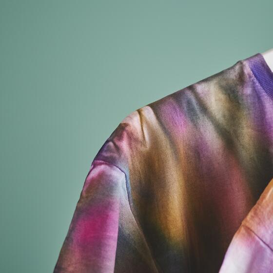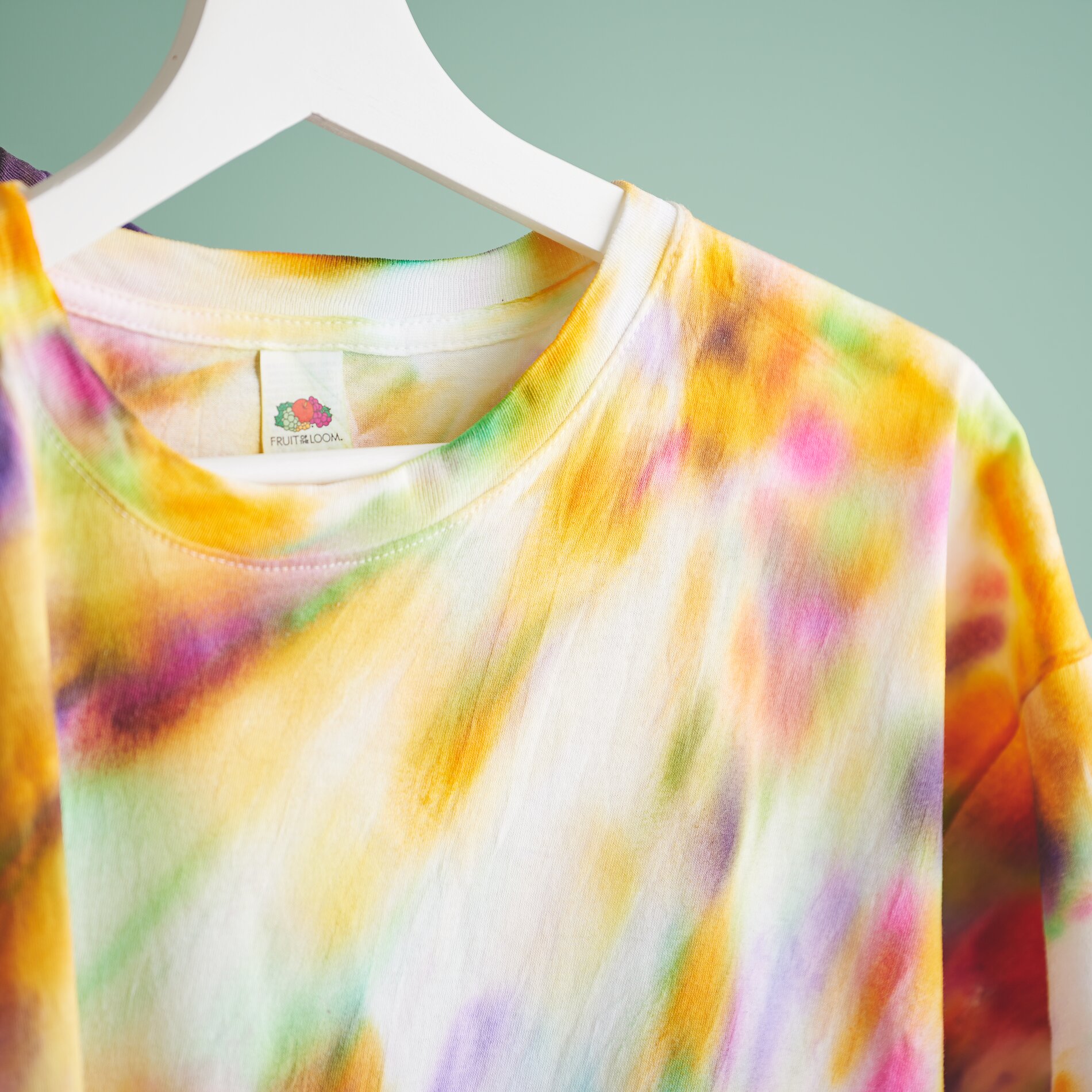 Po farbowaniu proszę ostrożnie rozłożyć koszulkę. Proszę nie ciągnąć mocno tkaniny, aby zachować gradienty kolorów. Następnie proszę powiesić koszulkę i pozostawić ją do całkowitego wyschnięcia. Kolor można utrwalić dopiero po całkowitym wyschnięciu tkaniny.