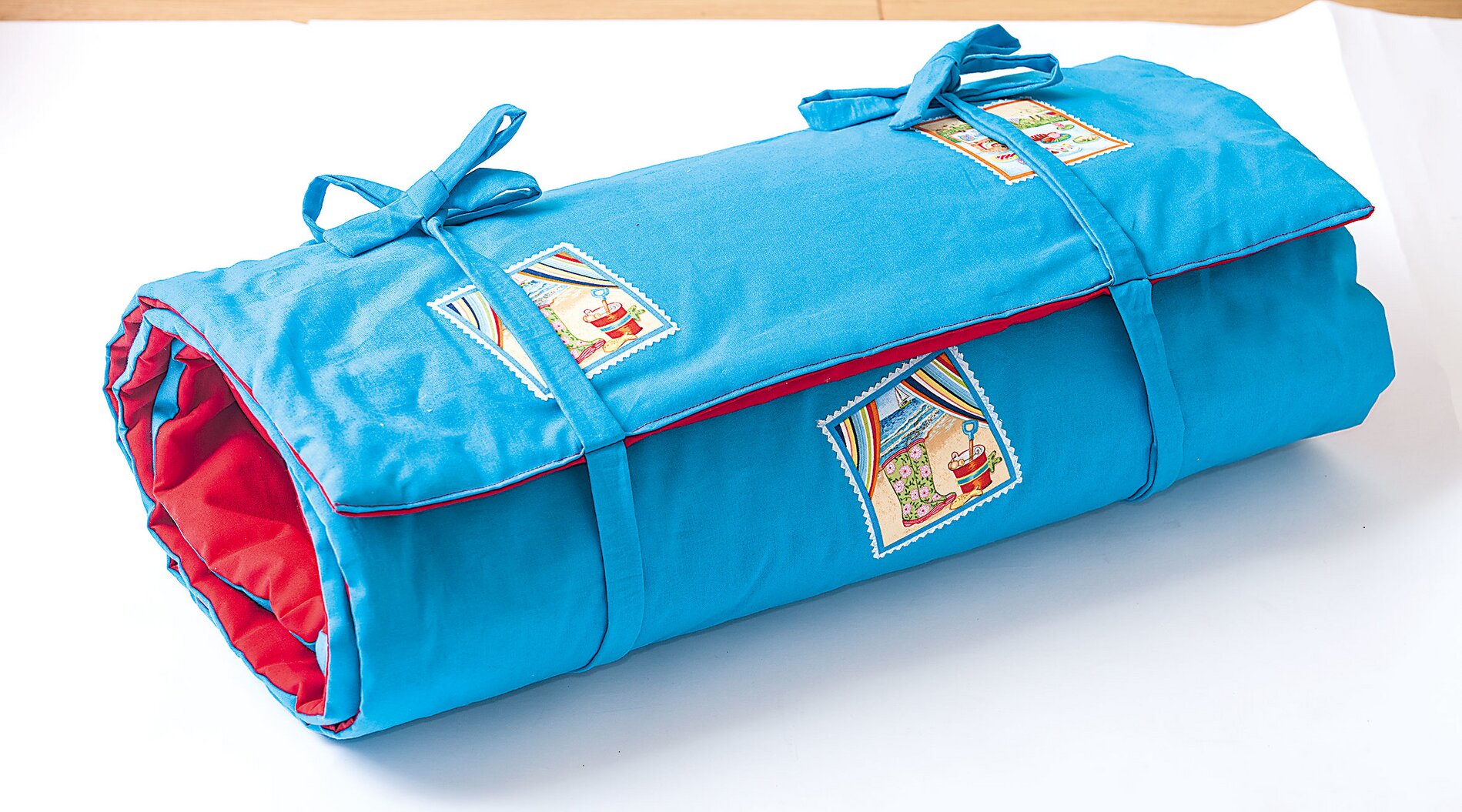 Duże prześcieradło plażowe z wszytą poduszką można związać wstążkami, tworząc poręczną rolkę, która zmieści się nawet w dużej, samodzielnie uszytej torbie plażowej. Wzór jest tak prosty, że mogą go wykonać nawet początkujący. Nic więc nie stoi na przeszkodzie, aby spędzić wspaniały dzień na plaży.