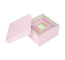 Bardzo ładny zestaw 12 kartonowych pudełek "Square" w pastelowych kolorach w opakowaniu XXL. Otrzymają Państwo 12 pudełek z pokrywkami w różnych rozmiarach od 3,5 x 3,5 x 2 cm do 14,5 x 14,5 x 7,5 cm. Pudełka są dostępne w kolorach miętowym, pomarańczowym, żółtym, fioletowym, jasnoniebieskim i morelowym.