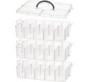Praktyczne pudełko do układania VBS z uchwytem. Pudełko składa się z trzech poziomów i pokrywy. Wymiary pudełka to ok. 24,5 x 16,5 x 18 cm. Materiał to przezroczysty plastik. Do pokrywy przymocowany jest uchwyt ułatwiający transport pudełka. Pudełka są połączone ze sobą po bokach za pomocą zatrzasku. Każdy z trzech poziomów podzielony jest na 10 przegródek. Przedziały można powiększyć, usuwając przegrody. Rozmiar jednej przegródki to ok. 4,8 x 8 cm.