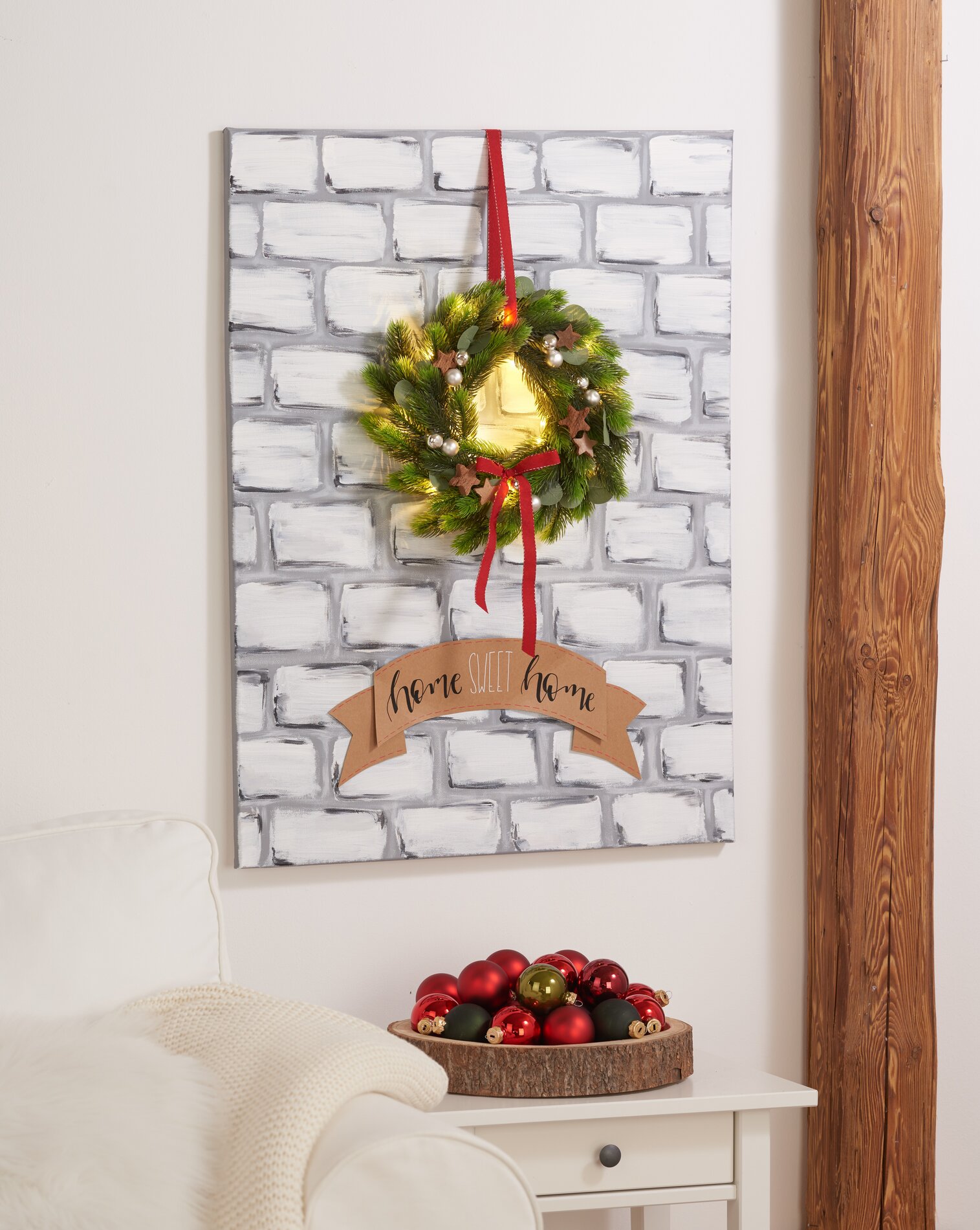 Aby uzyskać piękny wieniec, wystarczy owinąć wokół niego lampki i przymocować komorę baterii z tyłu, tak aby nie była widoczna. Następnie weź podwójne liście z gałęzi eukaliptusa i oderwij je od łodygi, a następnie rozłóż je i przymocuj do wieńca za pomocą gorącego kleju. To samo zrób z kokosowymi gwiazdkami i bombkami. W przypadku wstążki, weź kawałek o dowolnej długości (w naszym przykładzie ok. 50 cm). Przeciągnij go przez górną część wieńca, a następnie zszyj z tyłu ramy blejtramu. Możesz zawiązać kokardę z innego kawałka wstążki i przykleić ją do wieńca.
