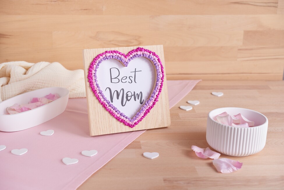 Teraz nadchodzi kreatywna część: nałóż klej rzemieślniczy na obszar ramki na zdjęcia, który chcesz ozdobić. Klej rzemieślniczy to uniwersalny klej, który bezpiecznie łączy ze sobą materiały takie jak papier. Teraz przyklej przygotowane kulki z bibuły bezpośrednio do sklejonego obszaru wokół motywu serca. Umieść pierogi tak, aby znajdowały się blisko siebie i całkowicie zakrywały serce. Poczekaj, aż klej dobrze wyschnie, aby upewnić się, że wszystko jest na swoim miejscu!