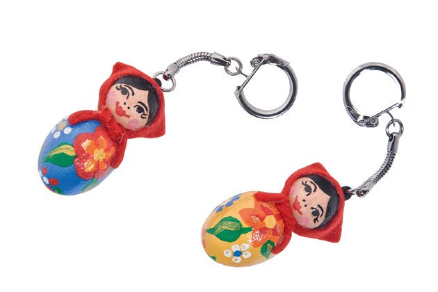 Małe miniaturowe matrioszki to popularne talizmany na breloczki do kluczy. Małe figurki są najpierw wykonywane, a następnie malowane w kolorowe wzory kwiatowe.