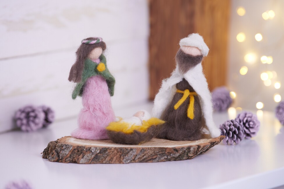 Wymodeluj wilgotny filc w pasujące płaskie runo, a następnie w poszczególne części potrzebne do stworzenia figurek: Ciało, brodę, włosy, łóżeczko itp. W razie potrzeby spłucz filc czystą wodą i delikatnie wyciśnij nadmiar wilgoci.