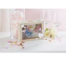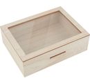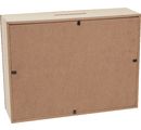 Wysokiej jakości skarbonka VBS ze szklanym okienkiem. Długość wynosi ok. 20 cm, szerokość ok. 7 cm, a wysokość ok. 15 cm. Materiał to drewno MDF. Tył skarbonki można otworzyć. Szklane wycięcie ma wymiary ok. 16,8 cm x 11,8 cm.