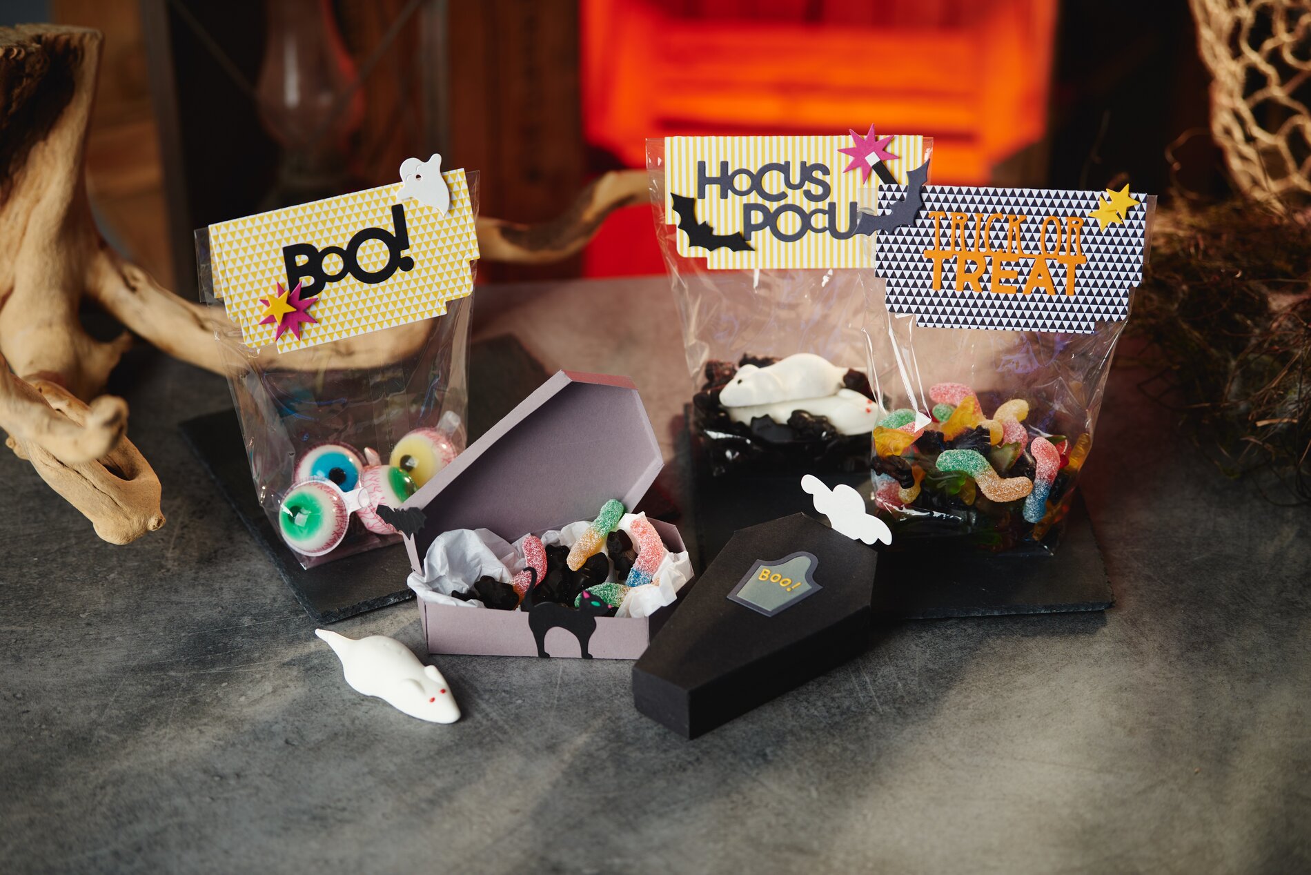 najpierw należy przenieść szablon na wybraną kartę ze zdjęciem, a następnie wyciąć i skleić. Kolejnym krokiem jest wykrojenie topperów i motywów Sizzix, a następnie zaprojektowanie ich według własnego uznania. Torebki mogą być już wypełnione i zaklejone zszywaczem lub dwustronną taśmą klejącą. Teraz wystarczy wypełnić trumny słodyczami i upiorne prezenty na Halloween są gotowe.