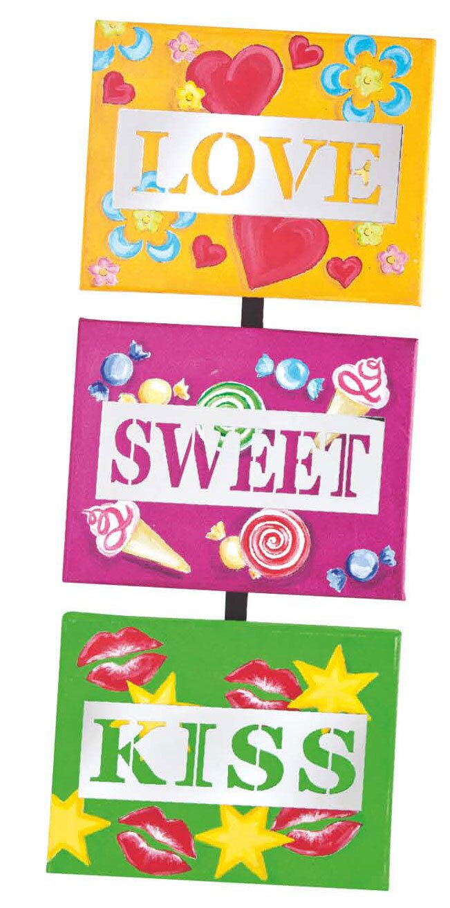 Do tego pomysłu na rękodzieło potrzebne będą 3 blejtramy o wymiarach 24 x 30 cm, kolorowa farba akrylowa i motyw lustra "Love, Sweet, Kiss".
