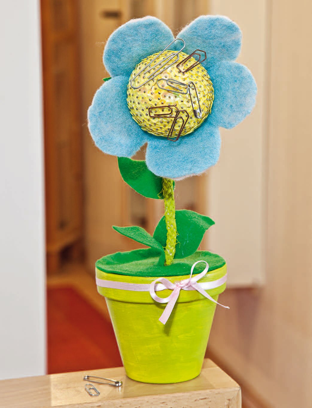 Filcowe liście i kwiat są przymocowane do drutu figurki za pomocą gorącego kleju. Na koniec przyklej cały kwiat do doniczki.