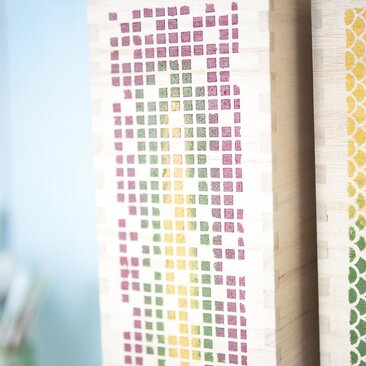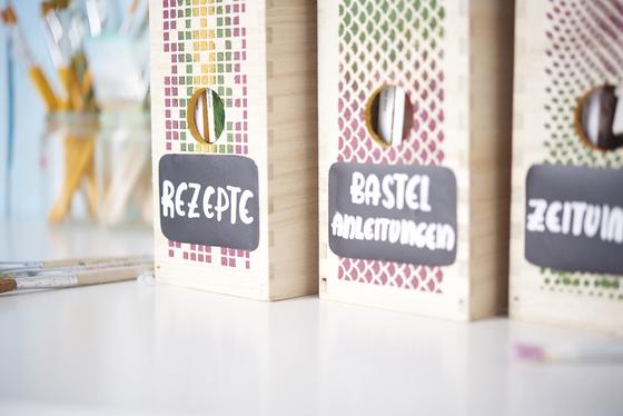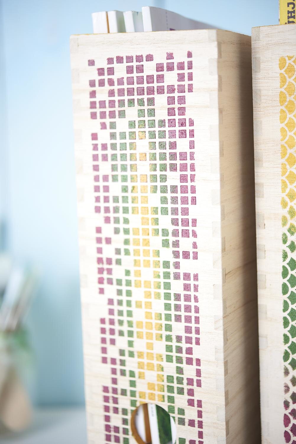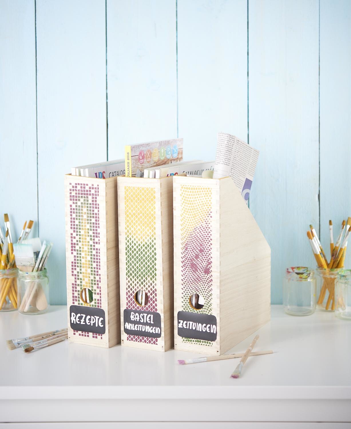 Kolektory stojące zostały zaprojektowane przy użyciu szablonu do kolorowania "Tripychon". Szablon ten składa się z trzech części motywu. Każda siatka motywu służy do zaprojektowania jednego stojaka na czasopisma. Spryskaj tylną część szablonu klejem w sprayu. Umieść wybrany motyw na powierzchni tylnej części stojaka na czasopisma.