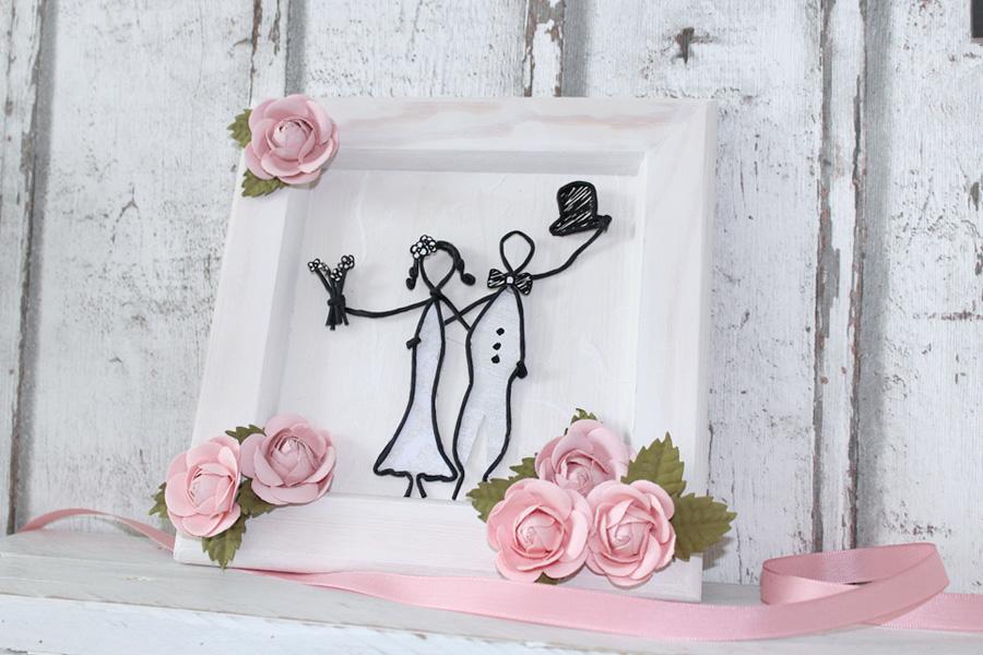 Przyklej gotowe figurki do ramki. W razie potrzeby zagnij drut po raz ostatni. Na koniec przyklej róże lub inne dekoracje do ramy. Gotowy obraz ślubny to wyjątkowy, spersonalizowany prezent!