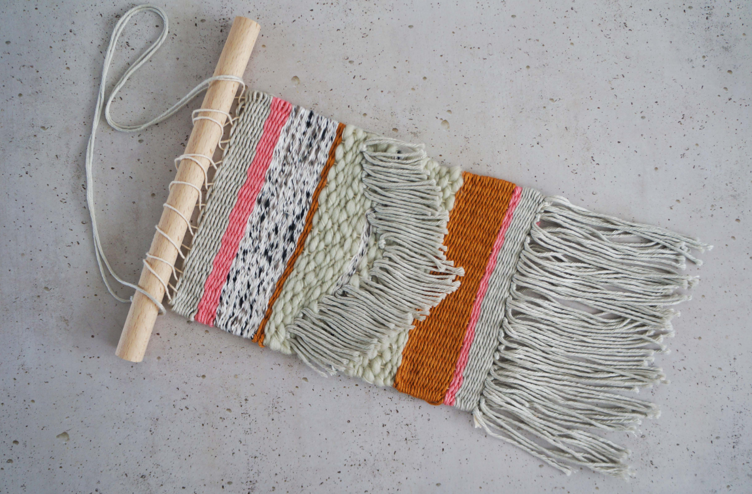 Przyszyj wszystkie wełniane nici do tyłu gobelinu za pomocą igły do szycia. Następnie przewlecz pętle przez drewniany patyczek, zawiąż nitkę na patyczku i zawieś biżuterię.