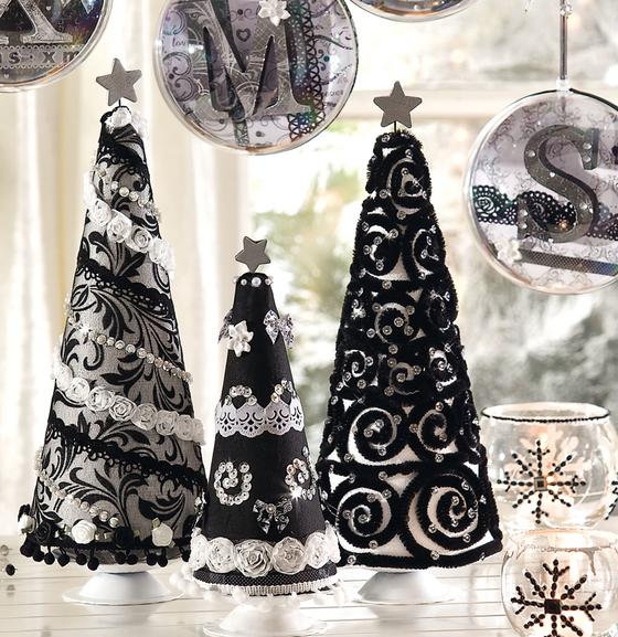 Te stylowe stożkowe drzewka osadzone na świecznikach są wspaniałą alternatywą dla zielonej choinki. Czarno-białe ramki są połączone srebrnymi cekinami jako punktami świetlnymi.