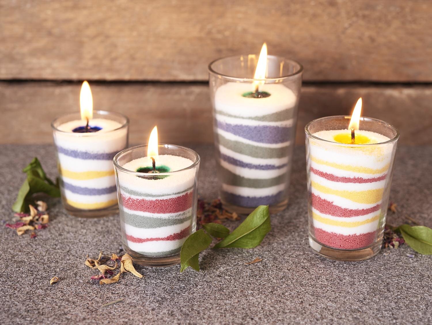 kolorowe wiaderka piaskiem do świec. Aby to zrobić, umieść