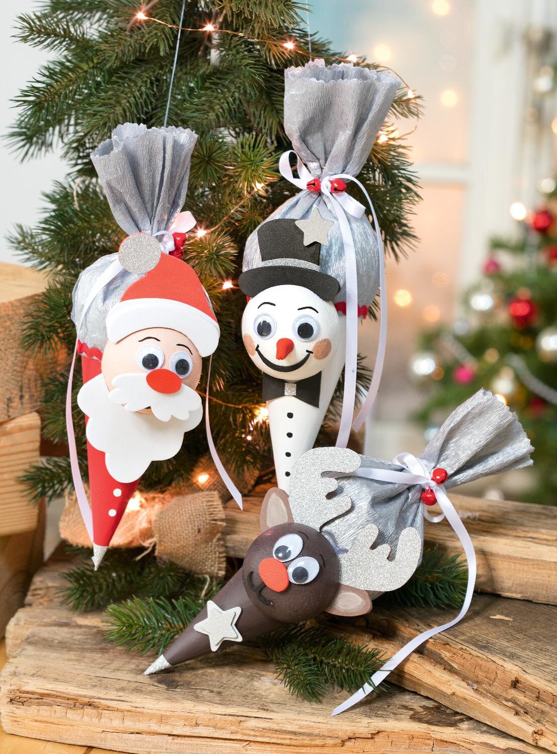 Srebrny papier krepowy jest przyklejony do krawędzi stożka, aby zamknąć torbę . Przyklejony szew można doskonale ukryć za pomocą warkocza. Papier krepowy przycina się nożycami do cięcia róż i zawiązuje satynową wstążką ozdobioną dzwoneczkami.