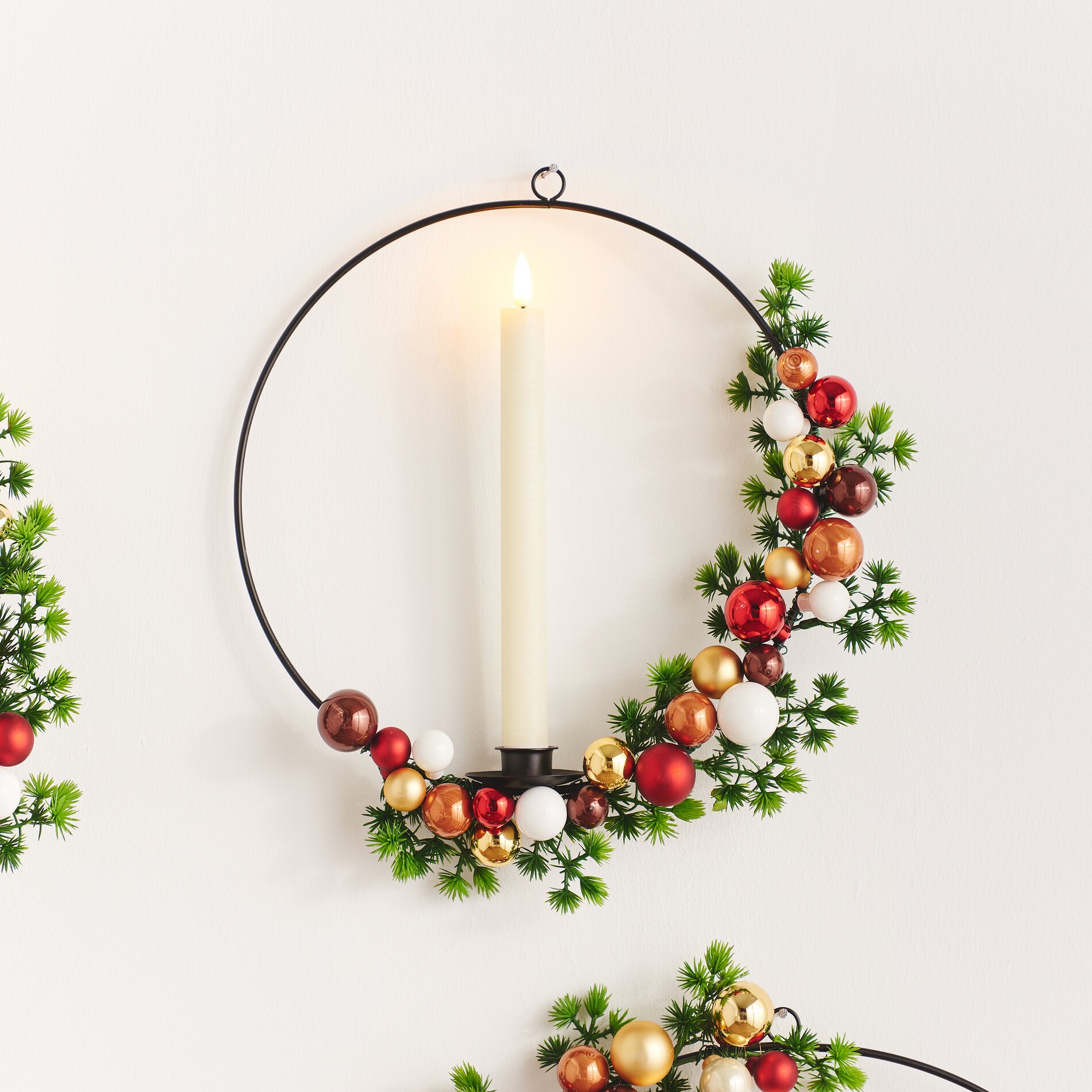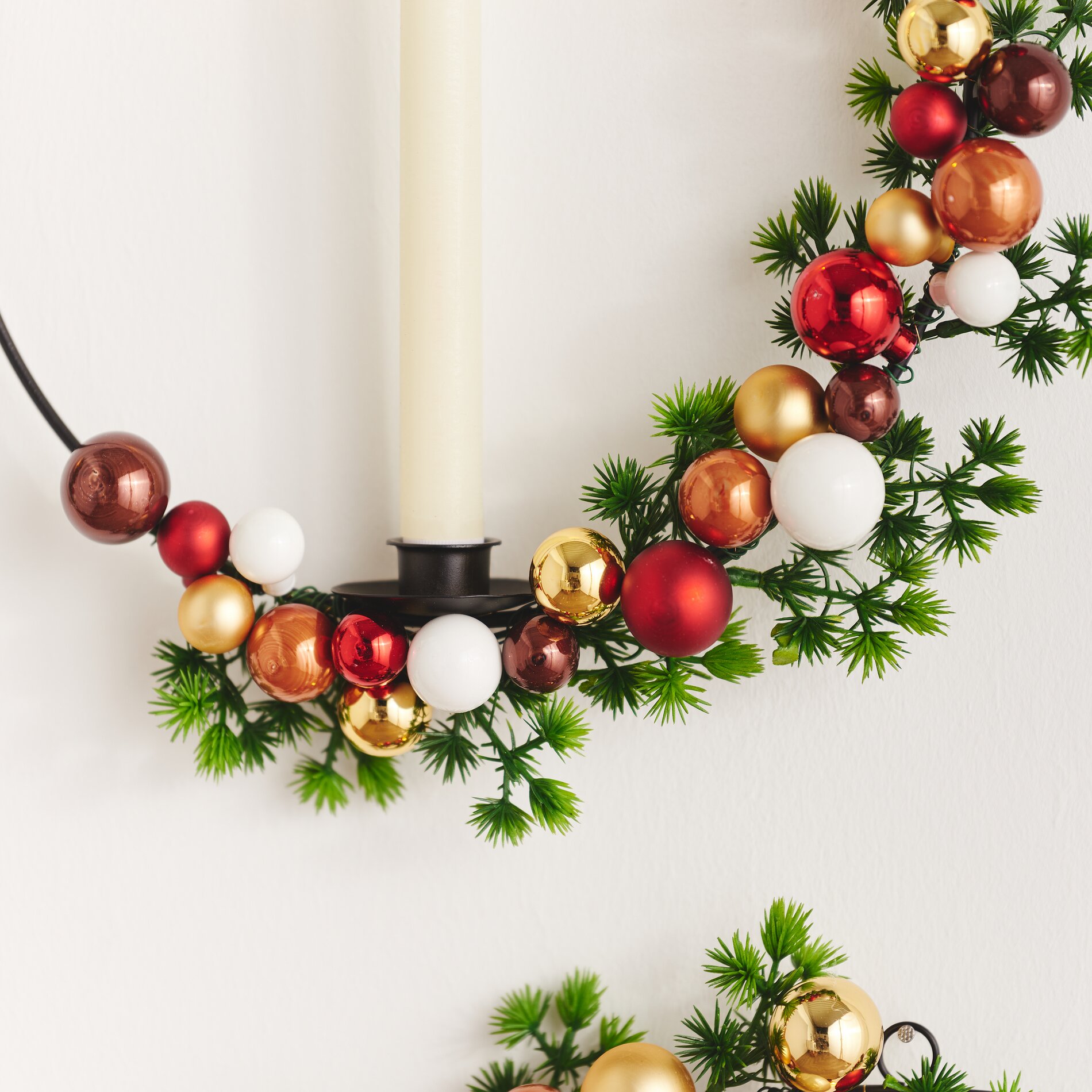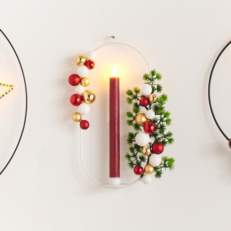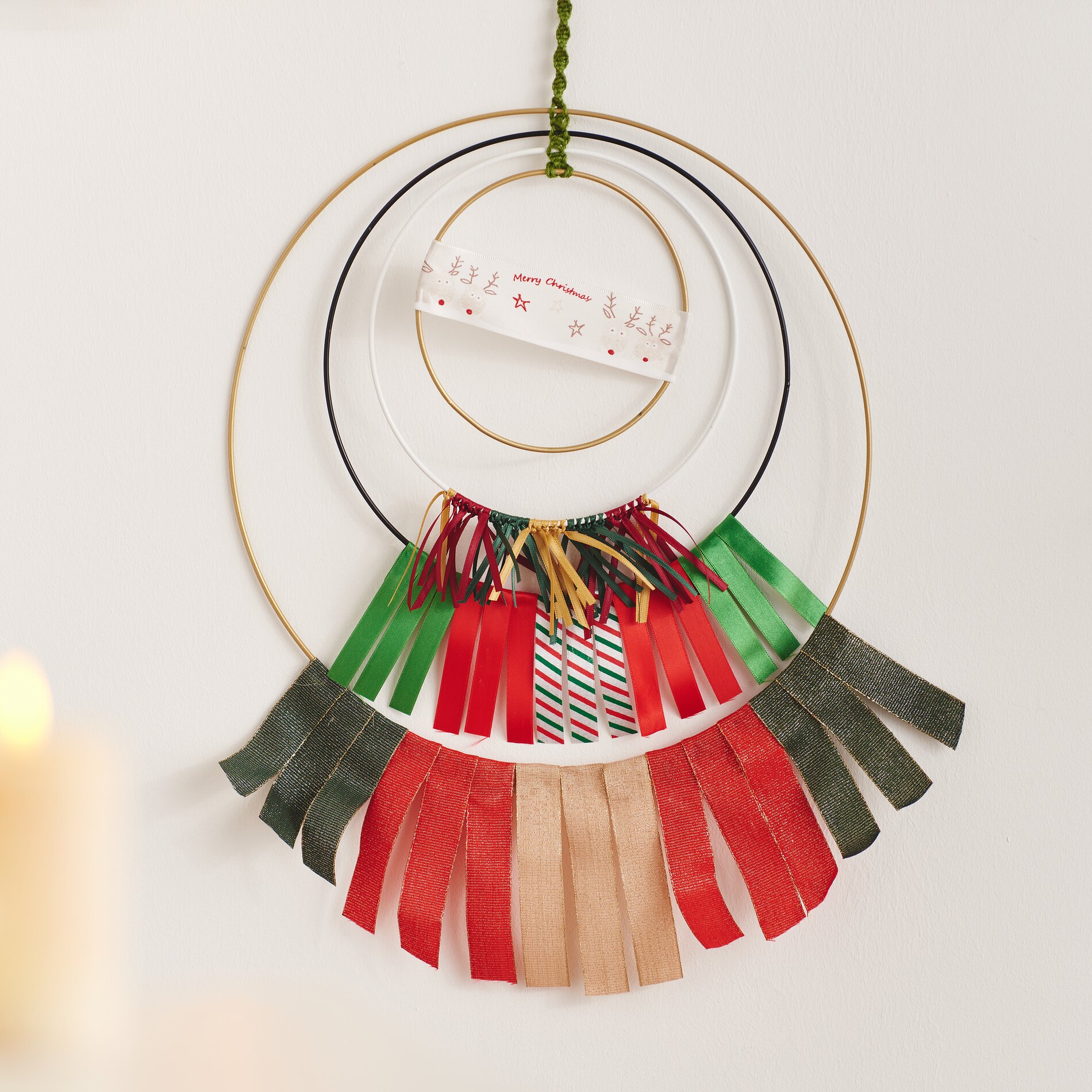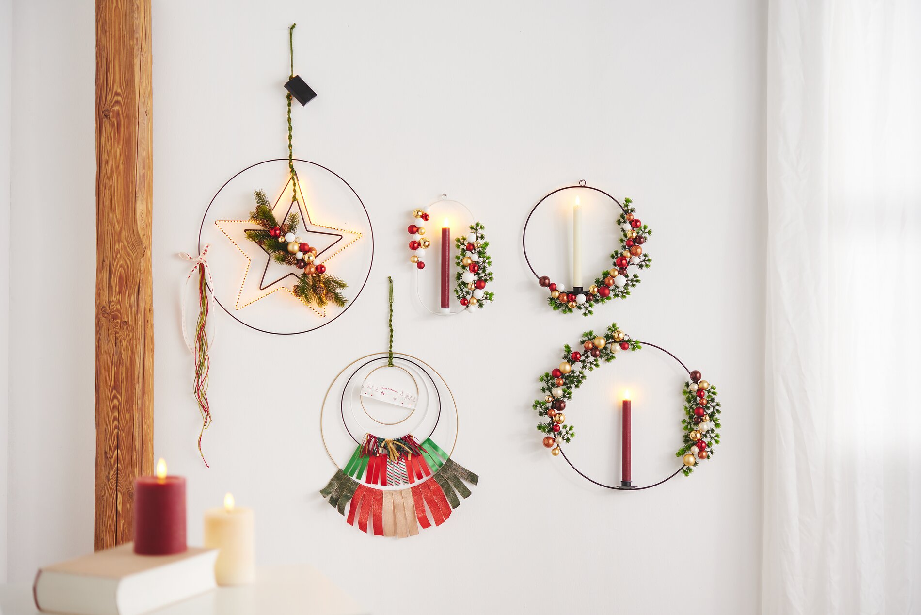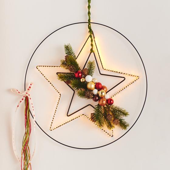 Metalowy pierścień z gwiazdamiTen metalowy pierścień składa się z metalowego pierścienia o średnicy 45 cm, metalowego pierścienia "gwiazdy" LED o średnicy ok. 37 cm i metalowego pierścienia "gwiazdy" o średnicy ok. 25 cm. Umieść trzy części przed sobą w sposób, w jaki chcesz je ułożyć: metalowy pierścień na zewnątrz, a dwie metalowe gwiazdy wewnątrz.