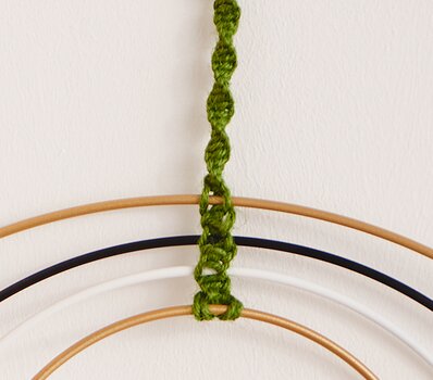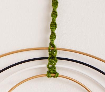 Węzłem spiralnym i kontynuuj wiązanie węzła, aż dotrzesz do zewnętrznego pierścienia. Przywiąż go również do zawieszenia makramy. Kontynuuj wiązanie węzła i zawiąż przewód z komory baterii węzłem tak, aby był zintegrowany z wiązanym pasmem. Gdy tylko stworzysz w ten sposób wystarczająco długie zawieszenie, uformuj pętlę z zawiązanych nici i zawiąż ją z końcowym "węzłem głowy skowronka".