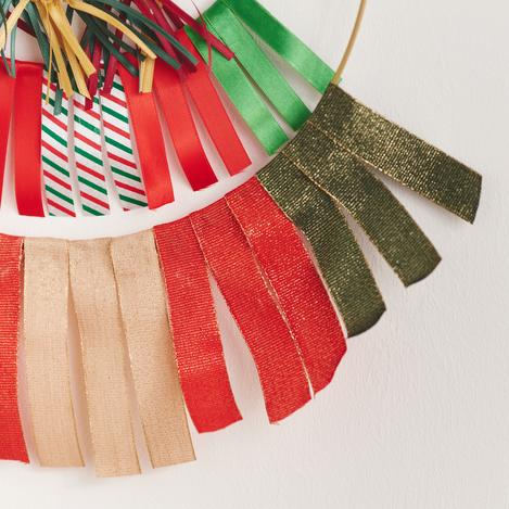 "węzeł skowronka" wokół małej gwiazdki. Masz teraz do dyspozycji cztery nitki. Użyj tych czterech nici, aby zawiązać wstążkę ze spiralnym węzłem do większej gwiazdy. Teraz zawiąż ją za pomocą
