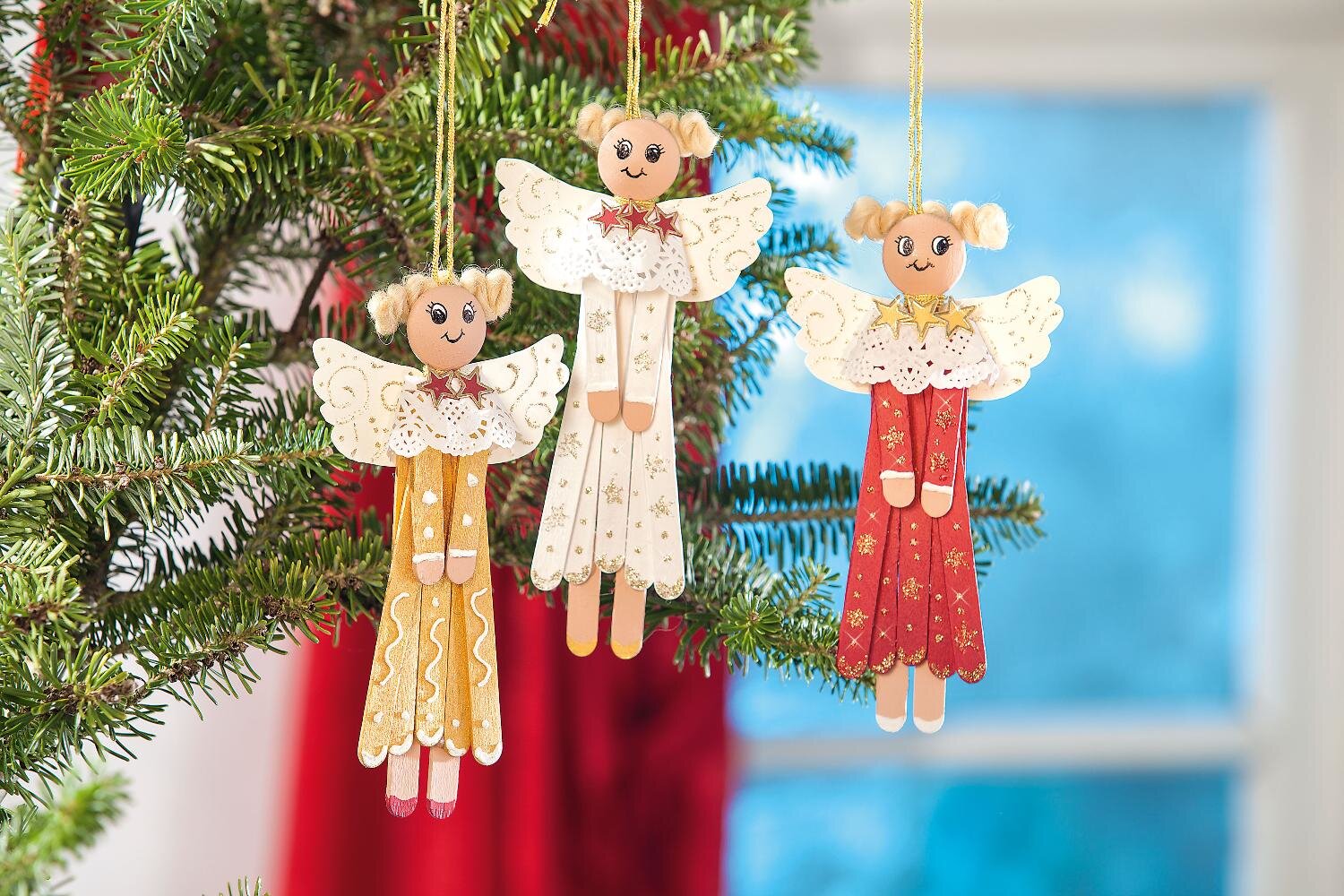 Te urocze blond aniołki bożonarodzeniowe można podarować znajomym lub powiesić na choince. Są one wykonane z pomalowanych drewnianych patyczków i mają papierowe skrzydła. A oto jak to działa: Najpierw pomaluj drewniane patyczki i deseczki. Na każdego anioła będziesz potrzebować - pięciu kolorowych patyczków - jednego patyczka w kolorze skóry na nogi - jednego kolorowego patyczka z końcówkami w kolorze skóry na ramiona. Po wyschnięciu sklej ze sobą 3 kolorowe patyczki od tyłu krótkimi kawałkami i dwoma po przekątnej na górze, aby stworzyć sukienkę. Krótkie kawałki można po prostu przyciąć do odpowiedniego rozmiaru za pomocą obcinaka. Przyklej jeden z tych krótkich kawałków jako szyję, a następnie przyklej kawałek kartonu na górze jako głowę. Przetnij patyk na ramiona na pół i przyklej go do sukienki. Podziel patyk na nogi na dwie części i przyklej je za nim. Następnie przetnij papier koronkowy na pół i wytnij ażurową krawędź kołnierza. Przyklej taśmę do krawędzi i przymocuj kołnierz wokół górnej części sukienki. Jeśli papier jest zbyt długi, możesz go odciąć. Dodaj różne gwiazdki na górze. W tym celu naklej naklejki reliefowe na karton, wytnij je, a następnie przyklej taśmą. Teraz przenieś szablon skrzydeł na wytłaczany karton, wytnij je i lekko obrysuj wytłoczoną strukturę za pomocą brokatowej wkładki. Aby zawiesić anioły, owiń złoty sznurek wokół szyi i przymocuj go za deską za pomocą odrobiny gorącego kleju. Następnie możesz również przymocować skrzydła za pomocą gorącego kleju. Na koniec możesz udekorować swoje anioły ozdobną folią śnieżną i brokatową, przykleić kawałek warkocza lalki i narysować twarze cienkim flamastrem.