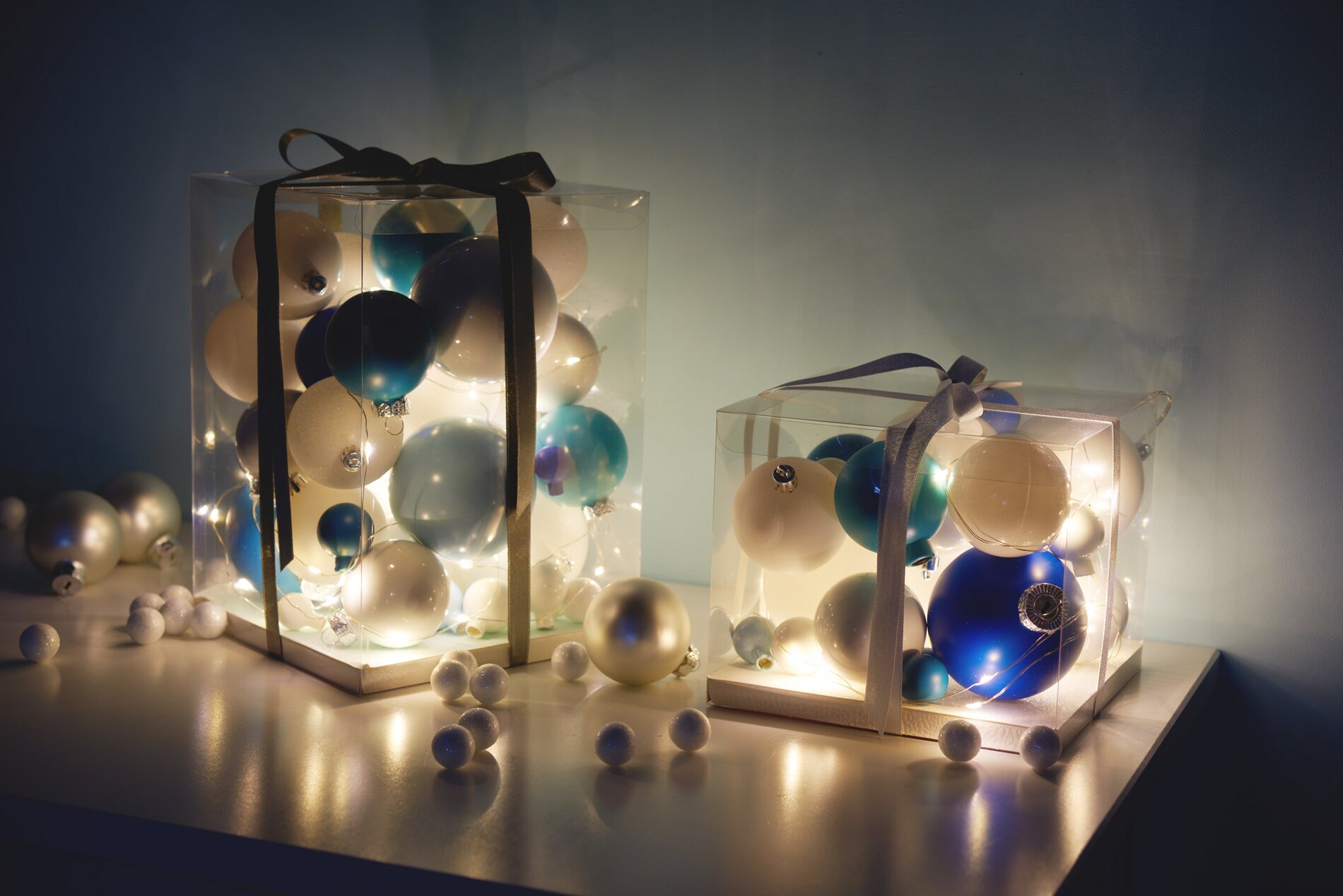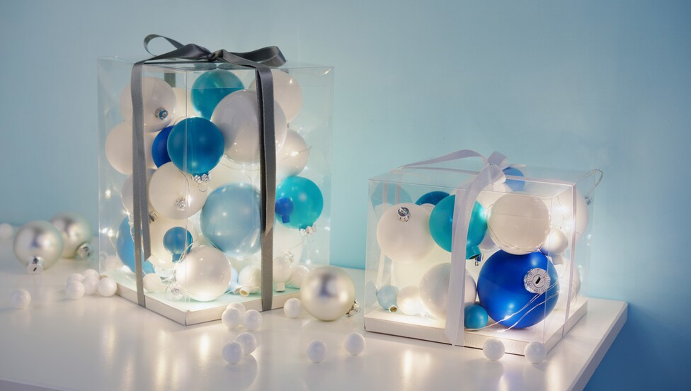 Do realizacji tego pomysłu potrzebne będą bombki świąteczne w różnych rozmiarach. Wybierz kilka bombek i spryskaj je farbą w sprayu w pasujących kolorach (do tego pomysłu użyliśmy trzech odcieni niebieskiego). Bombki najlepiej spryskać trzymając je na bambusowym szpikulcu.