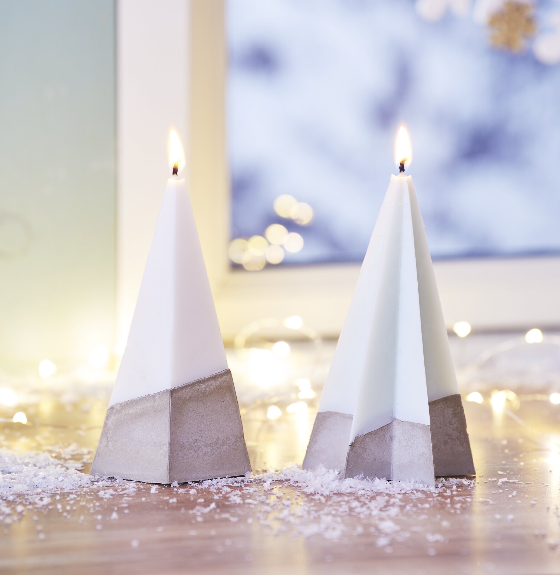 Złóż formę i zabezpiecz wszystko za pomocą dołączonej szyny zaciskowej. Papierowa forma jest od wewnątrz pokryta silikonem, który zapobiega przywieraniu gorącego wosku po wlaniu go do formy. Powłoka ta ułatwia również formowanie. Umieść formę pod niewielkim kątem w uchwycie. Kilka razy owiń woskowany knot wokół patyczka, umieść go na szczycie piramidy i zawieś knot w formie. Knot jest przeciągany przez końcówkę na dole, a następnie uszczelniany za pomocą dołączonego silikonowego krążka.