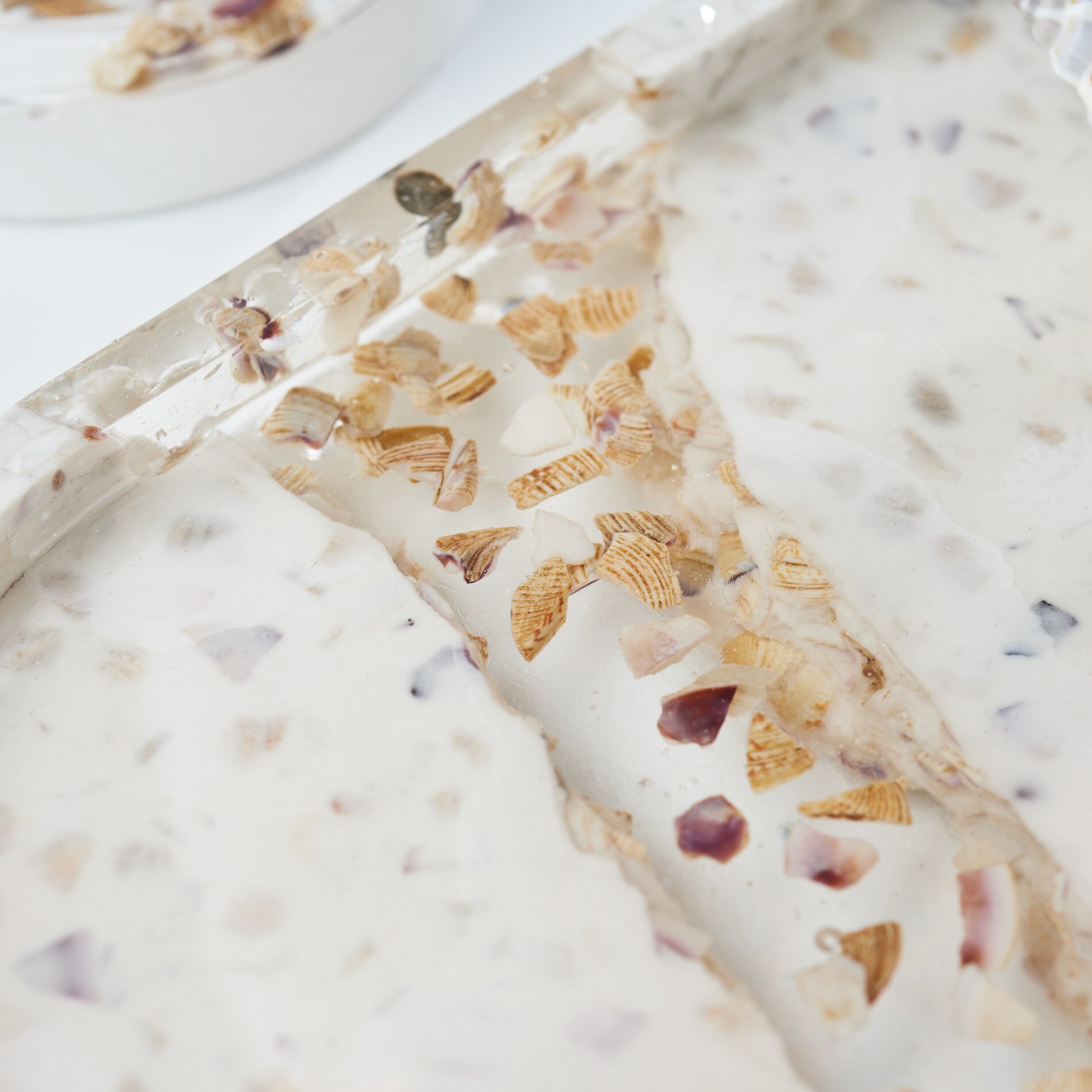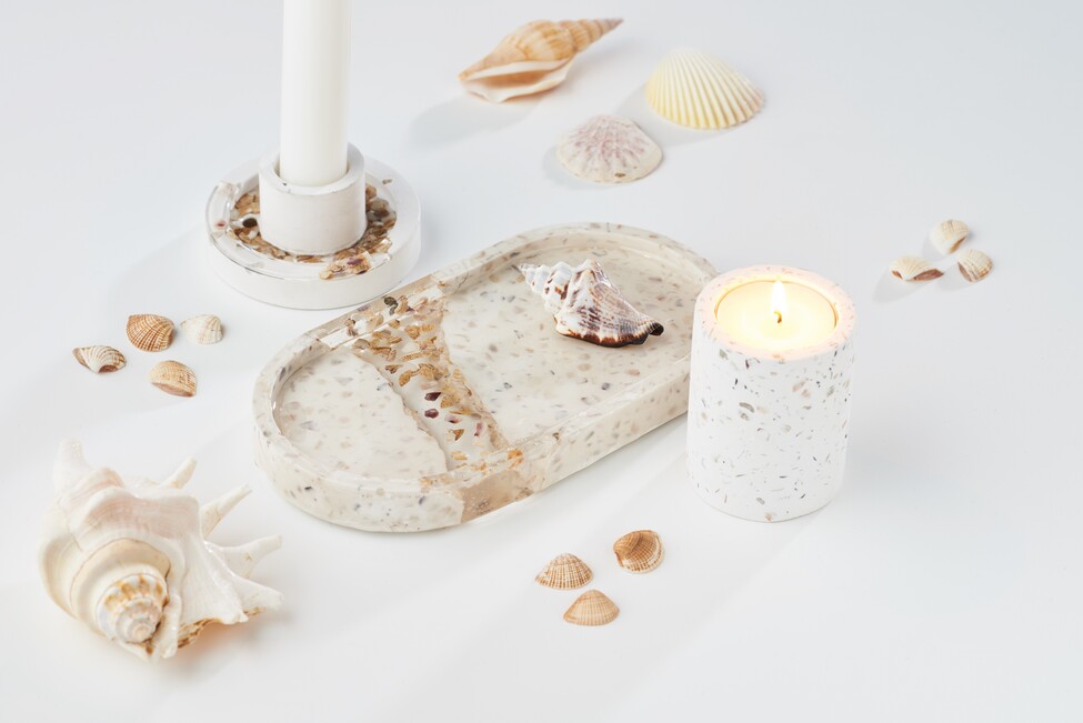 Wymieszaj ok. 5 łyżek stołowych Raysin z wodą do uzyskania kremowej masy. Następnie dodaj granulki muszli i energicznie wymieszaj. Wlej mieszaninę do silikonowej formy i lekko postukaj nią o powierzchnię, aby pęcherzyki powietrza uniosły się. Po około 30 minutach można wyjąć podstawkę z formy. Stuknij nią o krawędź stołu, aby ją połamać. Następnie włóż poszczególne części z powrotem do formy. Następnie wymieszaj trochę żywicy odlewniczej zgodnie z instrukcjami na opakowaniu i wlej ją w szczeliny w formie, tak aby pokryć podstawę. Pozostaw żywicę do wyschnięcia na 12 godzin. Po wyschnięciu wsyp trochę granulek muszli do formy odlewniczej. Ponownie wymieszaj żywicę odlewniczą i wypełnij nią formę. Po 24 godzinach schnięcia można wyjąć podstawkę z formy. Aby uszczelnić powierzchnię, wymieszaj więcej żywicy odlewniczej i pokryj powierzchnię pędzlem. Po kolejnym czasie schnięcia podstawka jest gotowa.