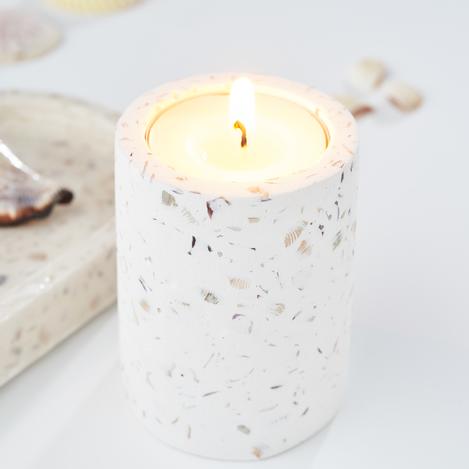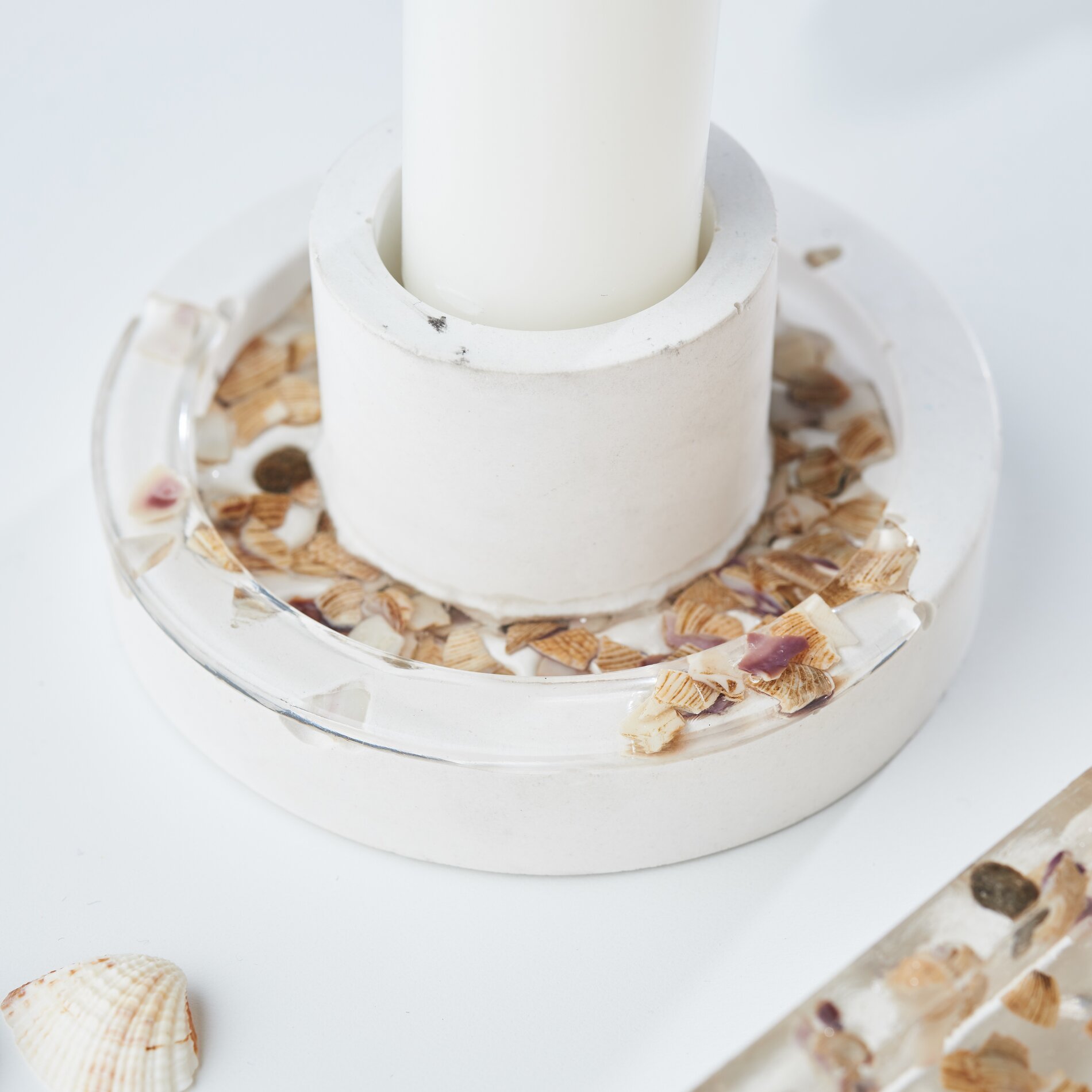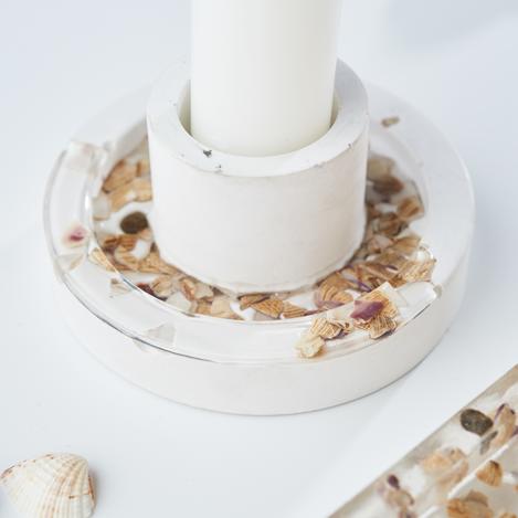 Wymieszaj ok. 4 łyżki stołowe Raysin z niewielką ilością wody do uzyskania kremowej masy. Dodaj trochę granulek muszli i ponownie energicznie wymieszaj. Wlej mieszaninę do formy odlewniczej i pozostaw do wyschnięcia na około 1 godzinę. Następnie ostrożnie wyjmij odlew z formy. Zwilż papier ścierny i szlifuj świecznik w sztyfcie, aż granulki muszli będą wyraźnie widoczne.
