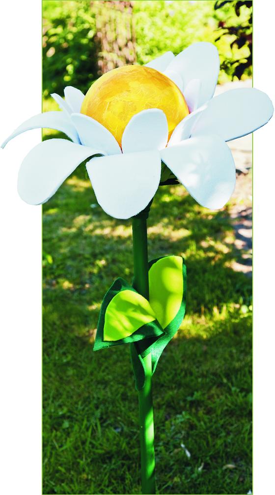 Pomaluj okrągły patyczek zieloną farbą i pozostaw do wyschnięcia. Włóż okrągły patyczek do akrylowej kuli i przymocuj go gorącym klejem. Przyklej mniejsze płatki do środka kuli za pomocą gorącego kleju i użyj większych płatków do stworzenia zewnętrznego wieńca.