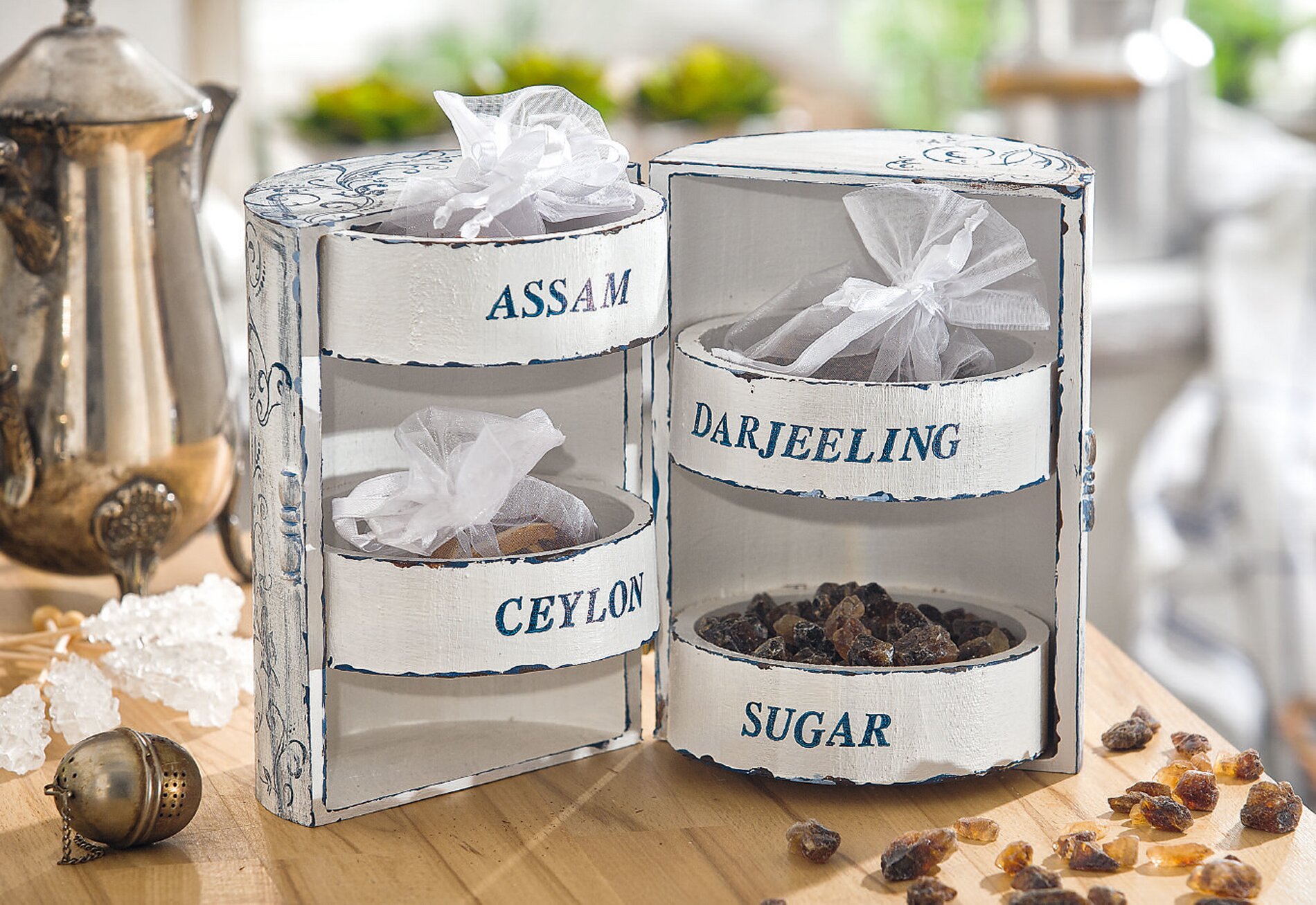 Zagruntuj szafkę na biało i pozostaw do wyschnięcia. Przetrzyj brązową farbą akrylową zewnętrzną powierzchnię za pomocą gąbki malarskiej i podkreśl uchwyty. Po wyschnięciu stempluj ozdoby. Wskazówka: Elastyczne silikonowe stemple mogą być również używane na okrągłych powierzchniach bez bloku akrylowego. Umieść żądany tekst na przedniej części poszczególnych przegródek. Obrysuj wszystkie krawędzie niebieską farbą rzemieślniczą, a następnie przetrzyj brązową farbą akrylową. Wymieszaj jasnoniebieską z granatową i białą farbą rzemieślniczą i użyj jej do dodania pojedynczych kropek na krawędziach, aby uzyskać wygląd emalii.