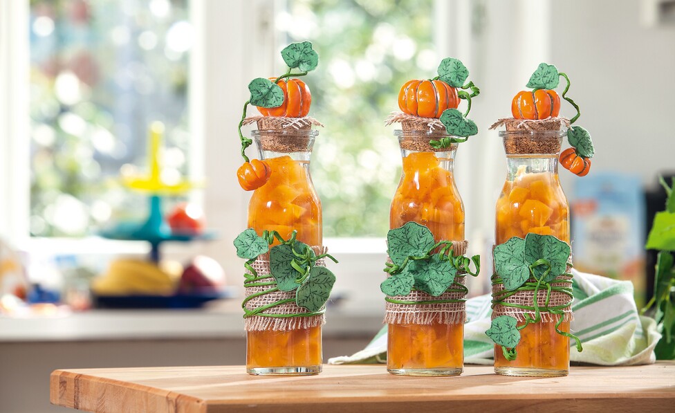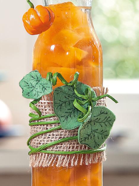 Wspaniała pamiątka, którą pokocha każdy fan dyni: marynowane dynie ze słoików wlewam do odpowiednio udekorowanych butelek, aby podarować je w prezencie. Ponieważ korki nie są hermetyczne, należy je spożyć w ciągu 1-2 tygodni.