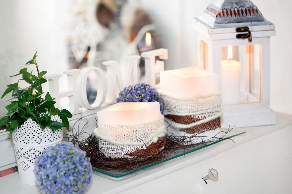 To takie proste:Owiń brązową i białą wstążkę jutową wokół świec i zabezpiecz końce gorącym klejem. Owiń filcowy sznurek i również przymocuj go na miejscu. Rozłóż dekoracyjną wierzbę na talerzu i udekoruj świece na wierzchu. Usuń łodygę kwiatu alium i umieść ją dekoracyjnie na środku świec.