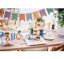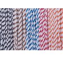 5 wstążek dekoracyjnych nawiniętych na kartkę, każda o długości 4 m, w kolorach pomarańczowo-białym, czerwono-białym, niebiesko-białym, naturalno-białym i czarno-białym.