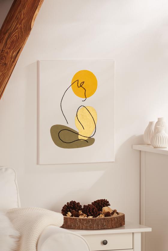 Teraz pomaluj poszczególne kolorowe obszary farbą akrylową. Oprócz żółtej i oliwkowej zieleni użyliśmy delikatnej złotej farby akrylowej. Pozostaw kolor do wyschnięcia.