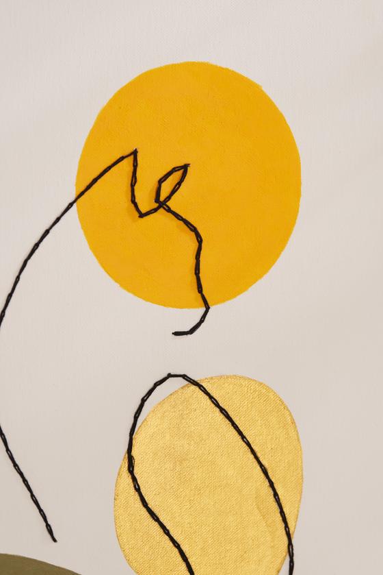 Weź nić do haftowania z czarnej perłowej nici, nawlecz ją i wyhaftuj motyw kota na ramie blejtramu, korzystając z wcześniej wykonanych otworów. My użyliśmy do tego ściegu łańcuszkowego, ale możesz również użyć bardzo prostych ściegów, aby "pokolorować" kontur kota za pomocą igły i nici.