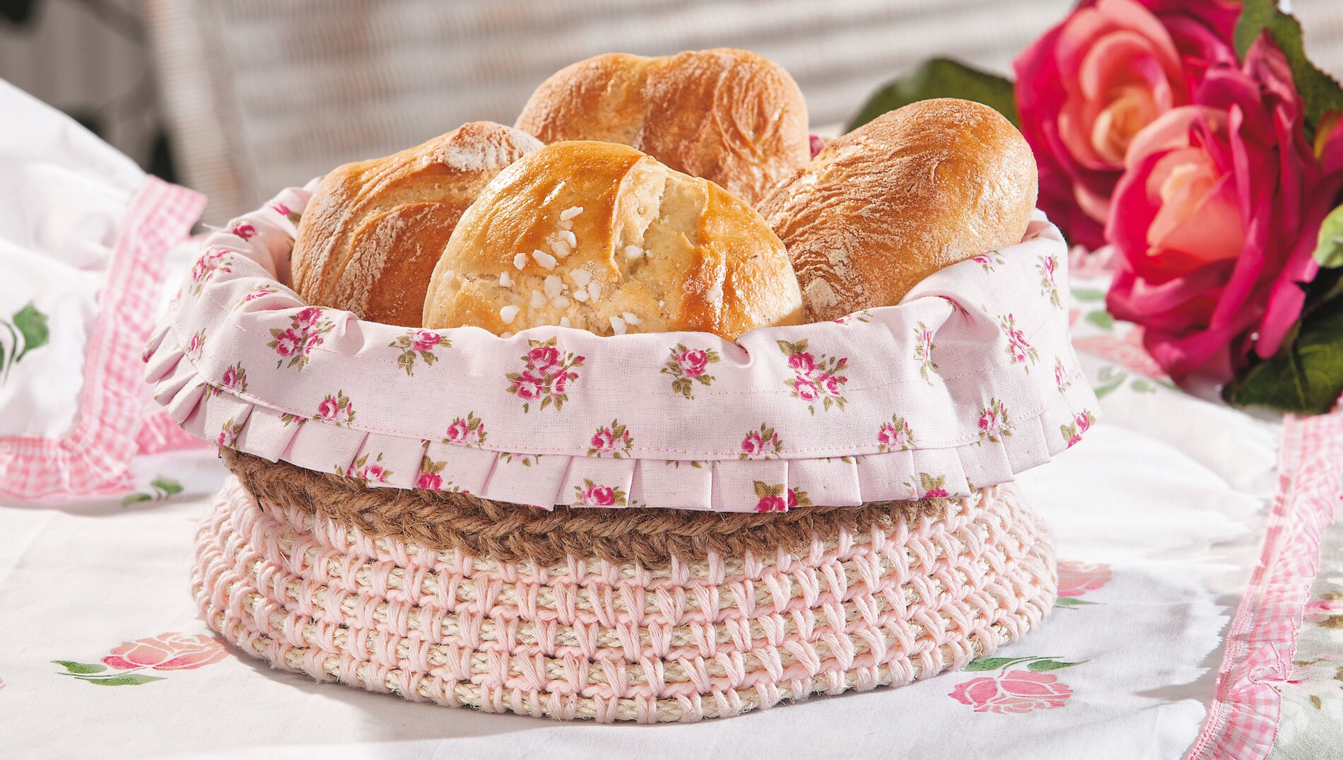 Ten koszyk na chleb w stylu wiejskim jest wykonany na szydełku z grubej przędzy jutowej i stabilizowany drutem. Z wkładką wykonaną z romantycznej tkaniny w róże, będzie ozdobą każdego stołu śniadaniowego.