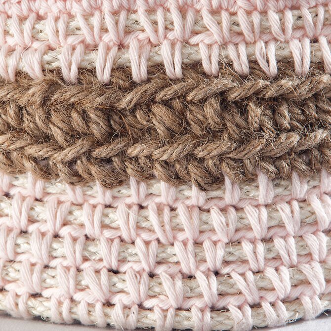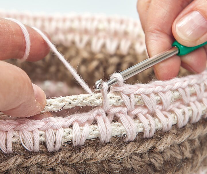 Ścianki boczne koszyka Umieść początek figury na drucie i szydełkuj wokół panelu z włóczki jutowej, używając różowej włóczki bawełnianej i szydełka w rozmiarze 4.0. Przerabiać oczko ścisłe szydełkiem bawełnianym w każde oczko włóczki jutowej i przerabiać oczko łańcuszka między każdym oczkiem ścisłym. W kolejnych okrążeniach zawsze przerabiać oczka ścisłe szydełkiem między oczkami ścisłymi poprzedniego okrążenia. Po 5 okrążeniach, odciąć drut figurowy mocnym nożem bocznym, ale pozostawić różową bawełnianą nitkę wiszącą. Teraz przerobić na szydełku 2 okrążenia włóczką jutową i szydełkiem w rozmiarze 7.0, a następnie ponownie 2 okrążenia drutem figurowym i włóczką bawełnianą. Na koniec przerobić na szydełku oczko ścisłe wokół krawędzi. Przeciągnij wszystkie nitki do środka, przymocuj koniec drutu do robótki pod podstawą za pomocą gorącego kleju.